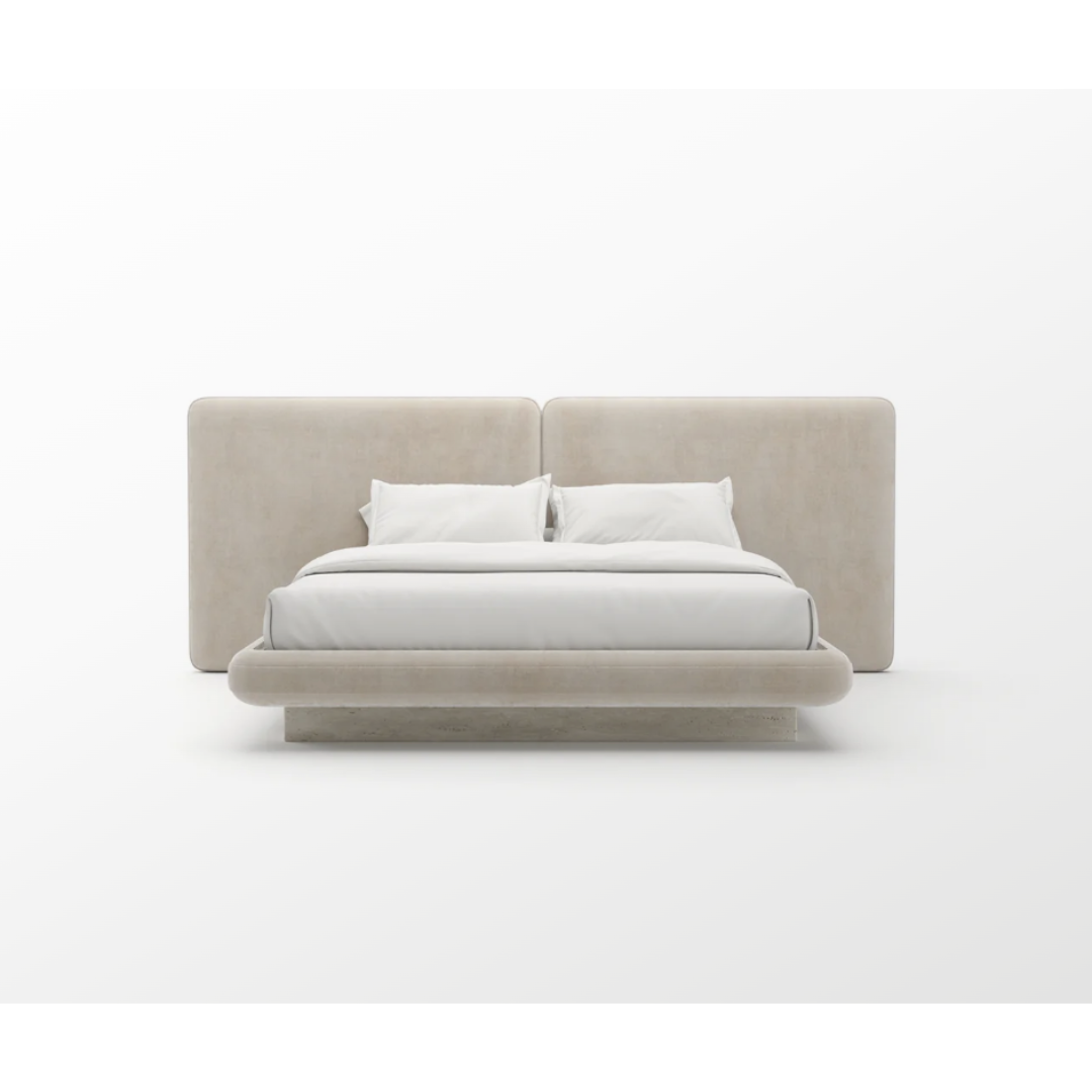 Elevate your bedroom experience with the Overlap 2 Panel Upholstered King Bed in Ivory. Meticulously upholstered with Whisper of Gold accents and grounded by an unfilled Travertine stone base, this bed in ivory vintage velvet is an alluring sanctuary designed for serene sleep and waking to elegance.