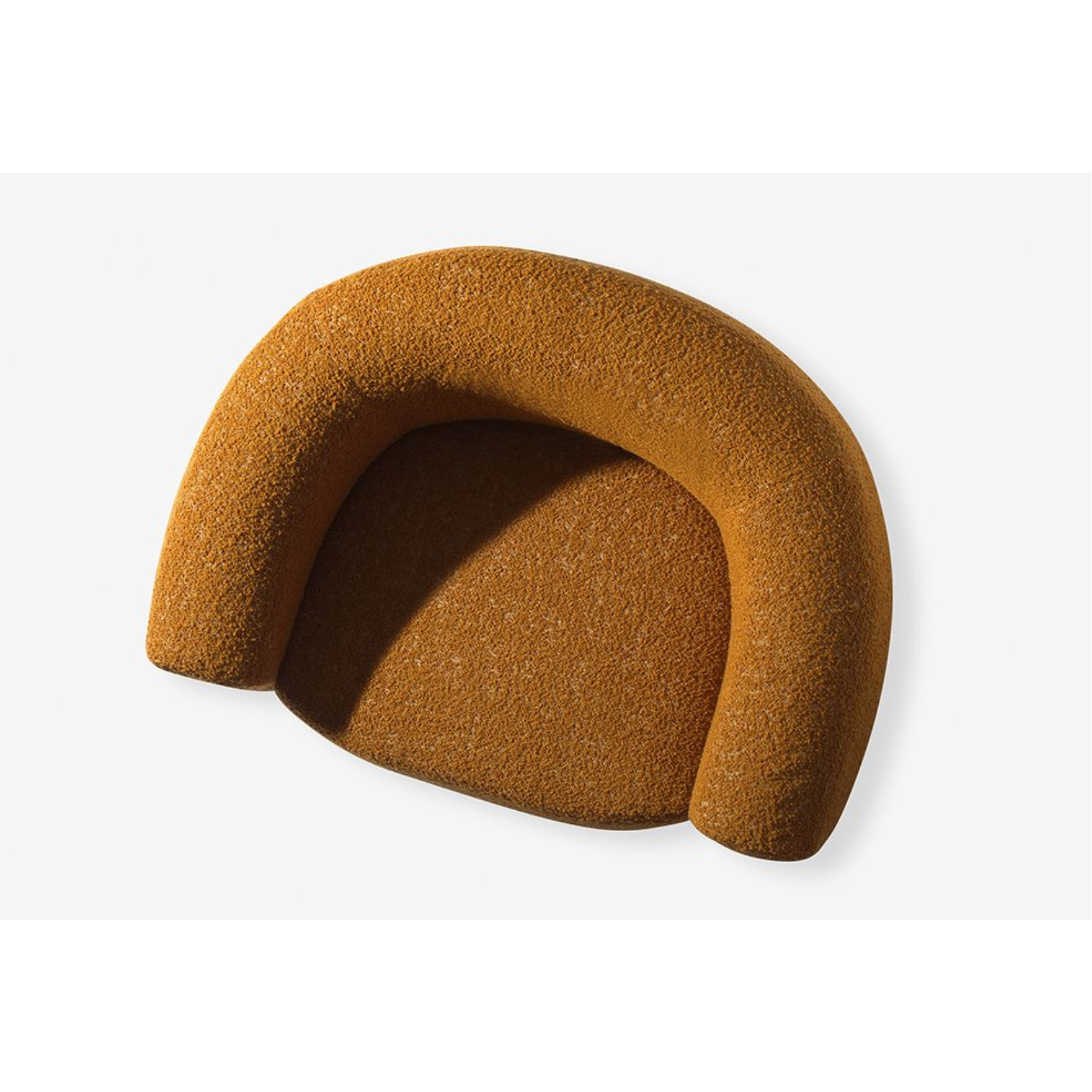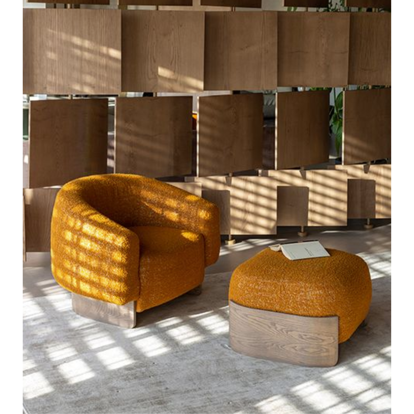 Designed by Giorgio Bonaguro for Carpanese Home, Betty is a generously-sized padded armchair. The main feature is the enveloping backrest that forms two comfortable armrests. The rounded shapes, emphasized by the curved wooden base, appear in the matching pouf, which gives the ensemble a sense of comfort, elegance and relaxation. The name — inspired by Betty Catroux, a muse of the prominent couturier Yves Saint Laurent — is a nod to an ideal of involuntary, timeless elegance, beyond fashion.