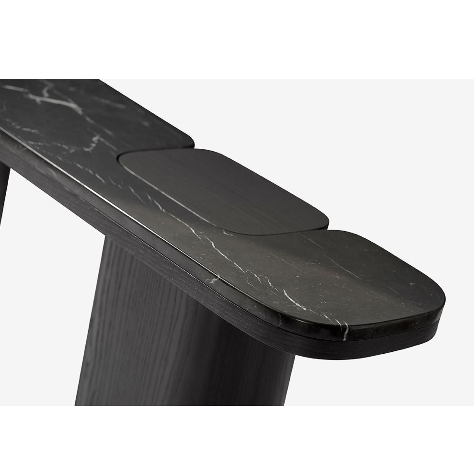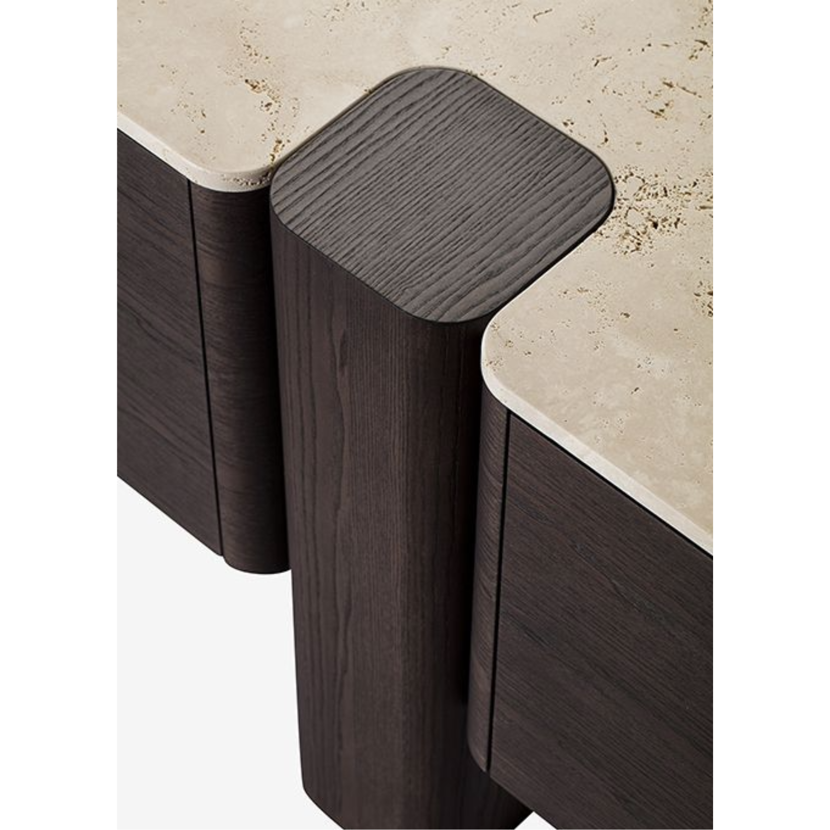 Designed by Giorgio Bonaguro for Carpanese Home in 2023, the Erice D sideboard joins the collection of coffee tables and console tables of different shapes and sizes designed the previous year and features wide legs and tops with beveled lines, combined in an apparently irregular way.