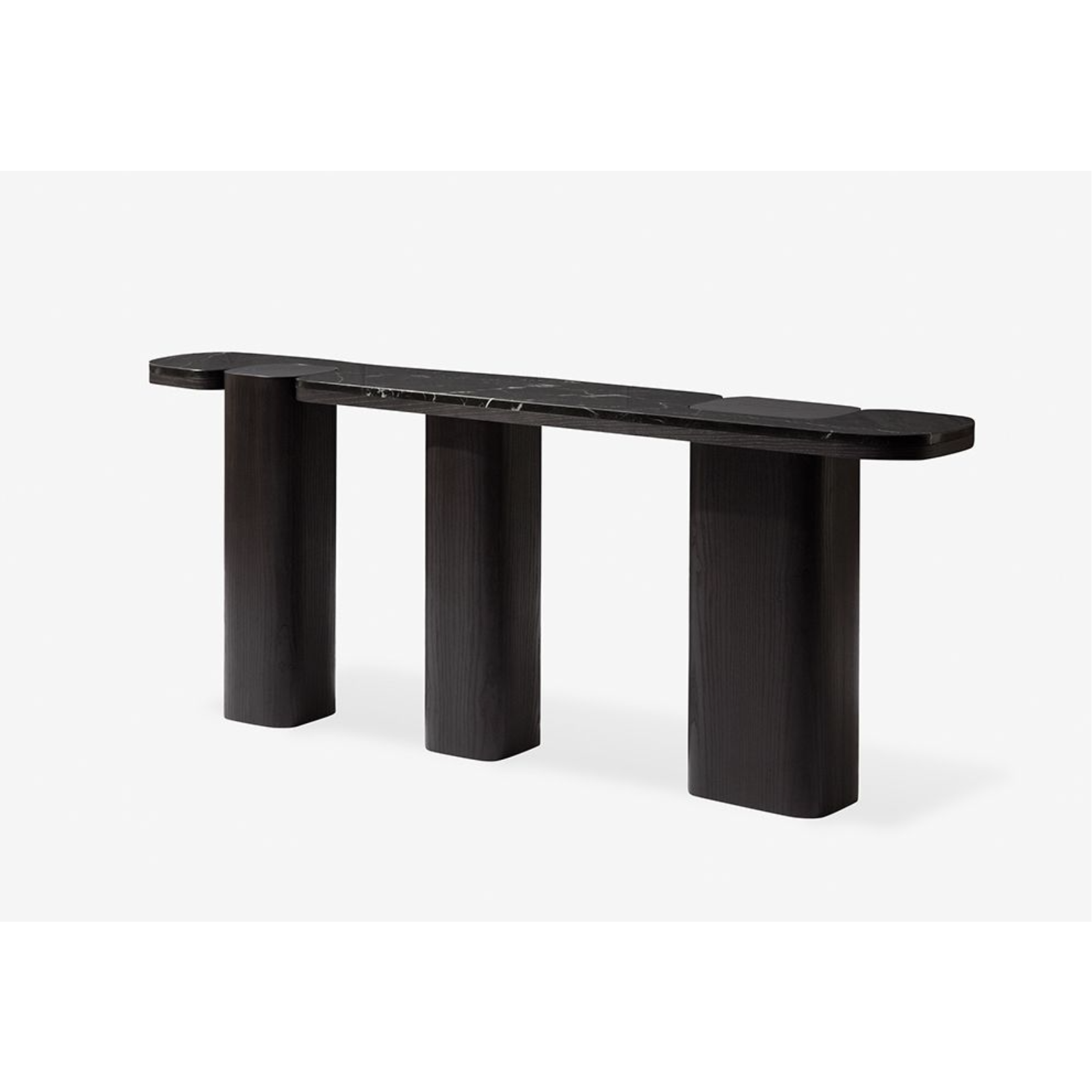 Designed with the same stylistic features, its structure entirely made of solid wood and tops made of marble or wood, the Erice D sideboard displays geometric connections that mimic the interlocking structure of cyclopean walls, in practical sizes.
