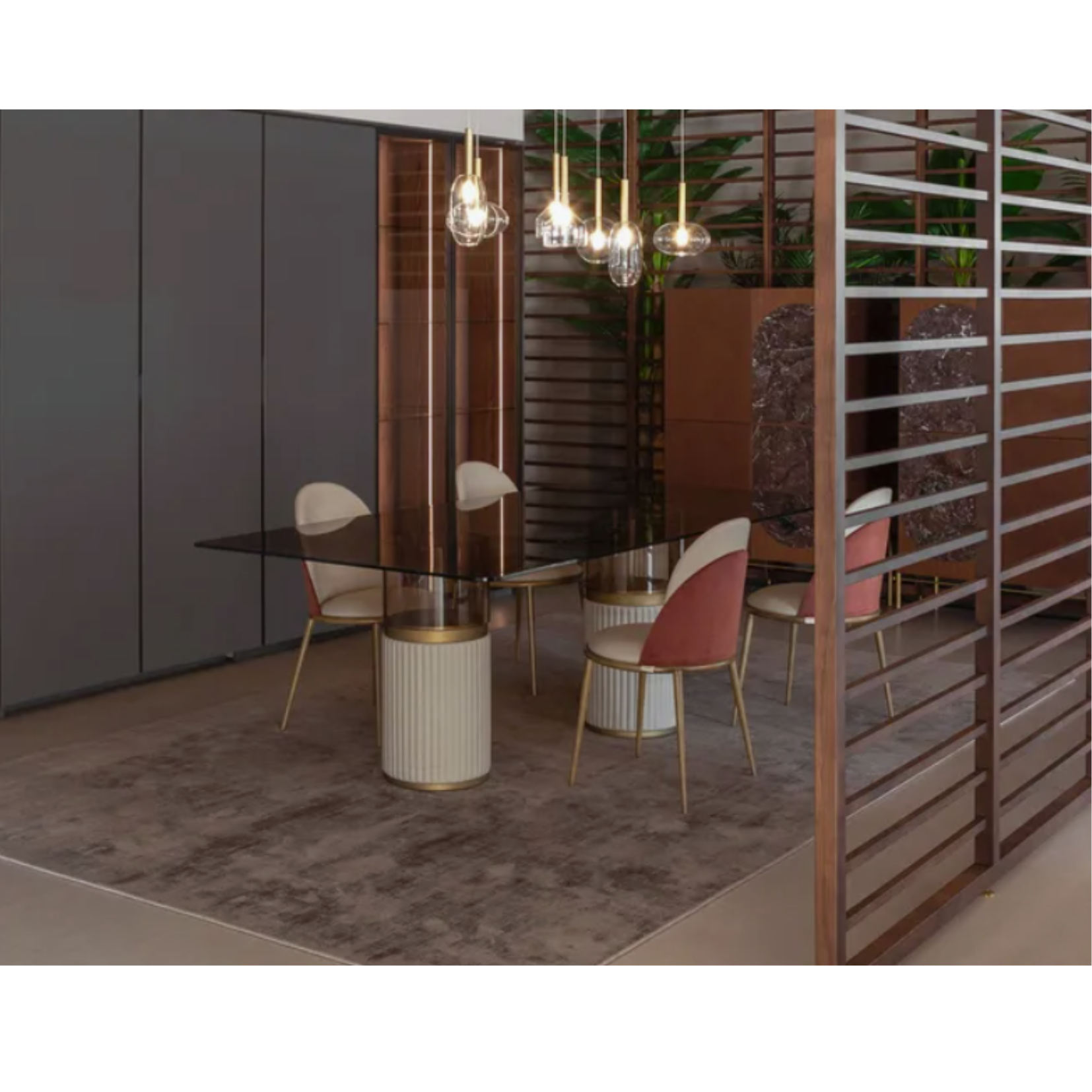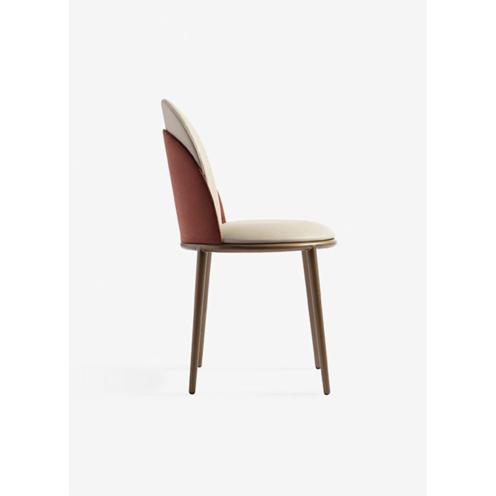 Designed by Carpanese Home, Georgette is a rounded chair with a double backrest that acts both as a support and a formal element. The delicate and graceful look is matched by its comfortable seat, with light padding that makes Georgette the perfect chair for the dining room or for an elegant but informal home office.
