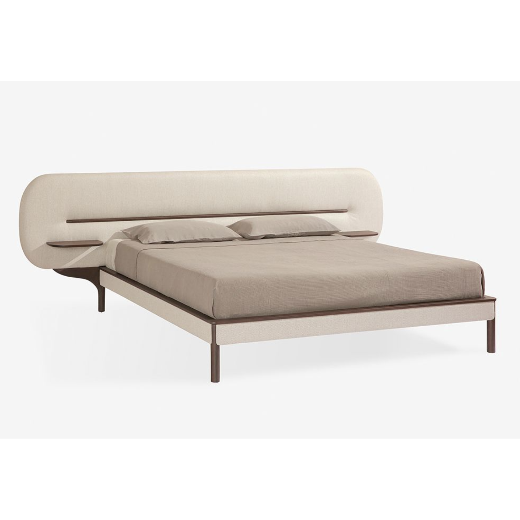 Designed by Matteo Zorzenoni for Carpanese Home, the Lips bed combines sinuous shapes, soft surfaces and meticulous attention to detail throughout the entire structure. The upholstered headboard — available in two sizes, L and XL — features a wooden crosspiece in the central part that forms the two large lips that give the bed its name, while the shaped solid-wood legs that support it mimic the unfolding of two wings. On request, the headboard in the XL version can accommodate two convenient wooden shelves. The slender bed frame has feet with pure lines, perfectly shaped to accommodate the covering fabric, while the thin solid-wood cover emphasizes the silhouette of the whole bed.