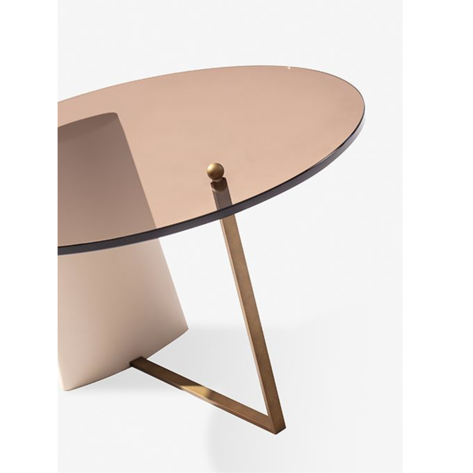 Designed by Carpanese Home, the base of the Rialto coffee table is made up of two parts, a slender elliptical cylinder made of wood and an angular frame of painted metal. These two very different elements in shape and material come together to make the Rialto stable and solid. It is completed with a warm and smoky tempered glass top. Available in two sizes — H & L — Rialto can be used as a single table or as a pair.