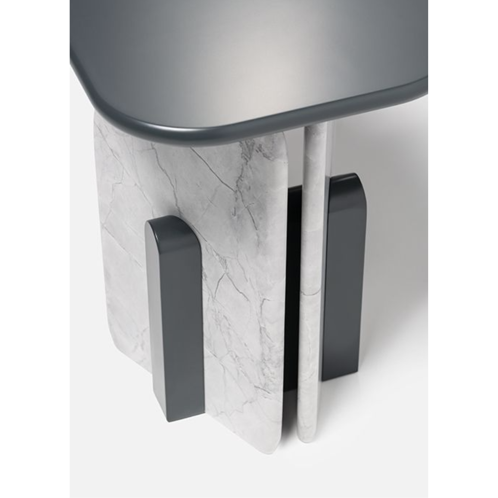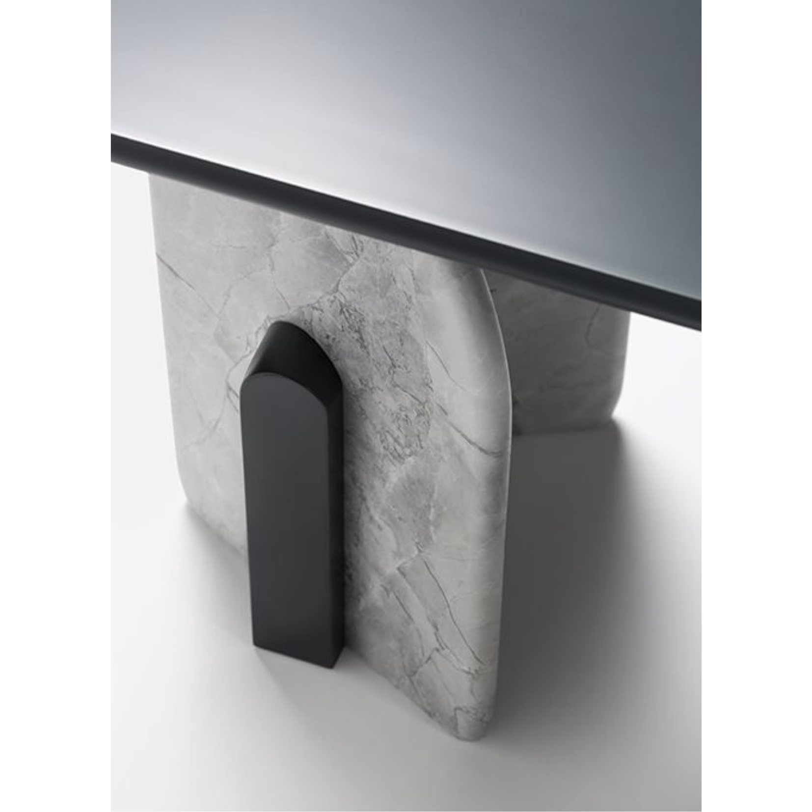 Designed by Matteo Zorzenoni for Carpanese Home, Slabs coffee table engages with shape perception and the flexibility of multiple perspectives. The result of interlocking flat multi-material panels, the legs of Slabs culminate in curved shapes that seamlessly integrate with the tabletop, giving the impression of a single, continuous and harmonious volume, with no clear interruptions between the different components. The lines of the top are softened by rounded corners to further reinforce the concept of a natural shape that is constantly evolving. Striking a balance between functionality and sculpture, in this project concept serves as both a practical object and an aesthetically enriching element within its environment.