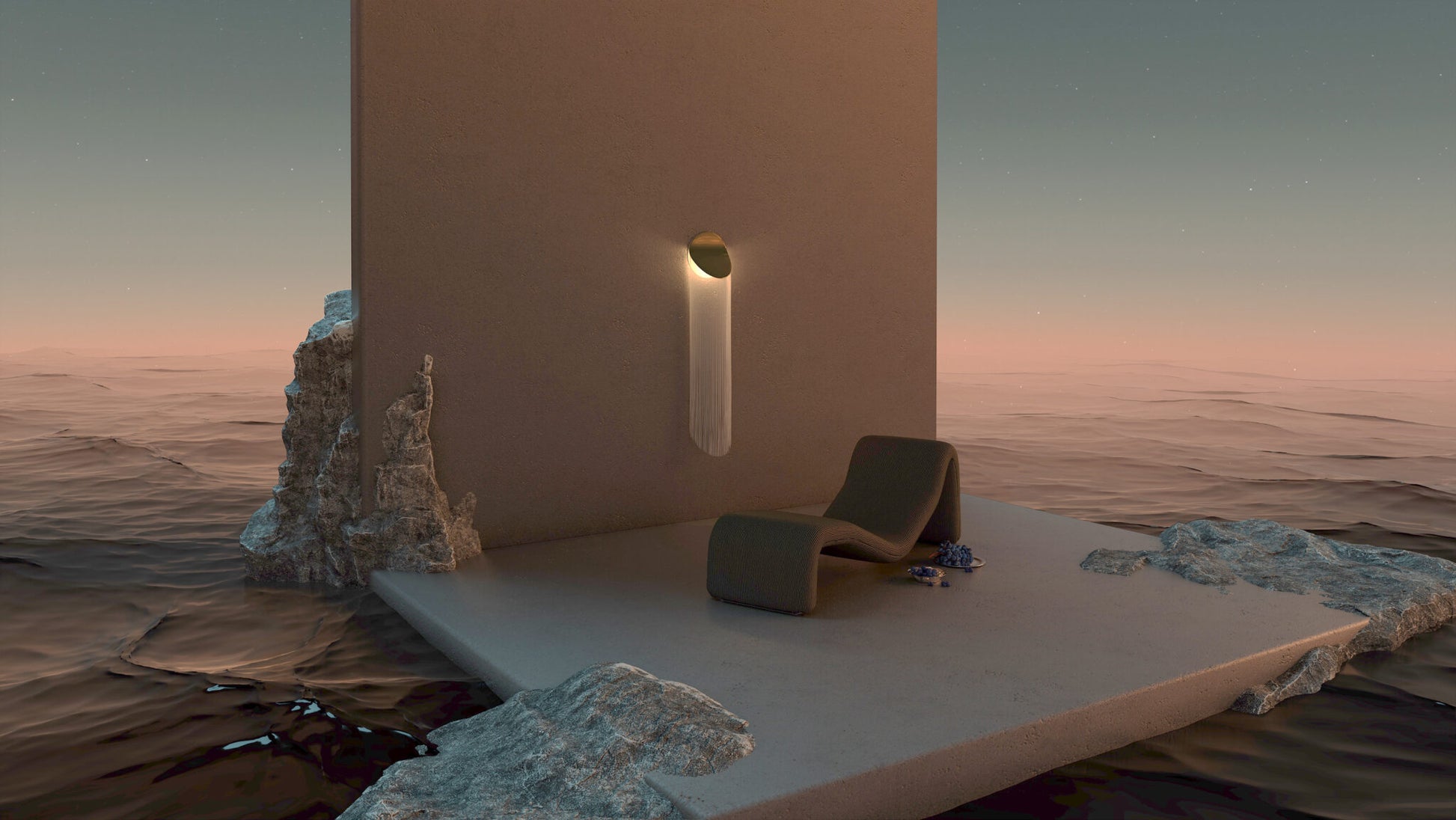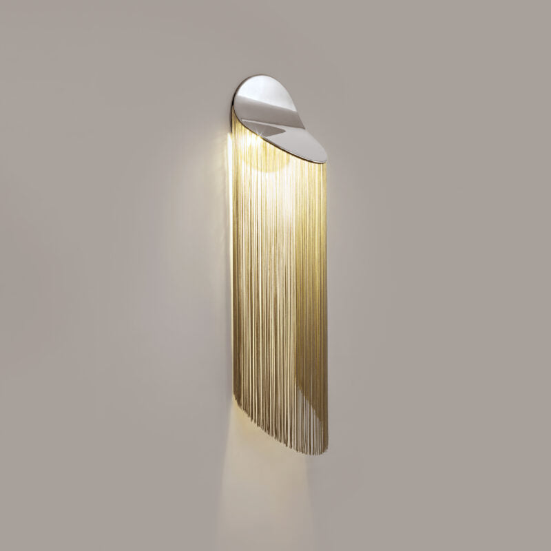 Cé jostles the obvious association between fringes and lighting by unveiling a classic revisited. The Cé Collection is inspired by Cécrops, who is believed to be the founder of Athens according to Greek mythology and would be the first native person. Spontaneously born from the earth itself, it was believed to be born half-snake half-man. The fringes recall the fluidity of the snake and the disc sends us back our reflection, bringing us back to our origins. Its anthropomorphic shape on the wall and the fringes that sift the light evoke a presence in the room. The Cé Wall honours the first nations.