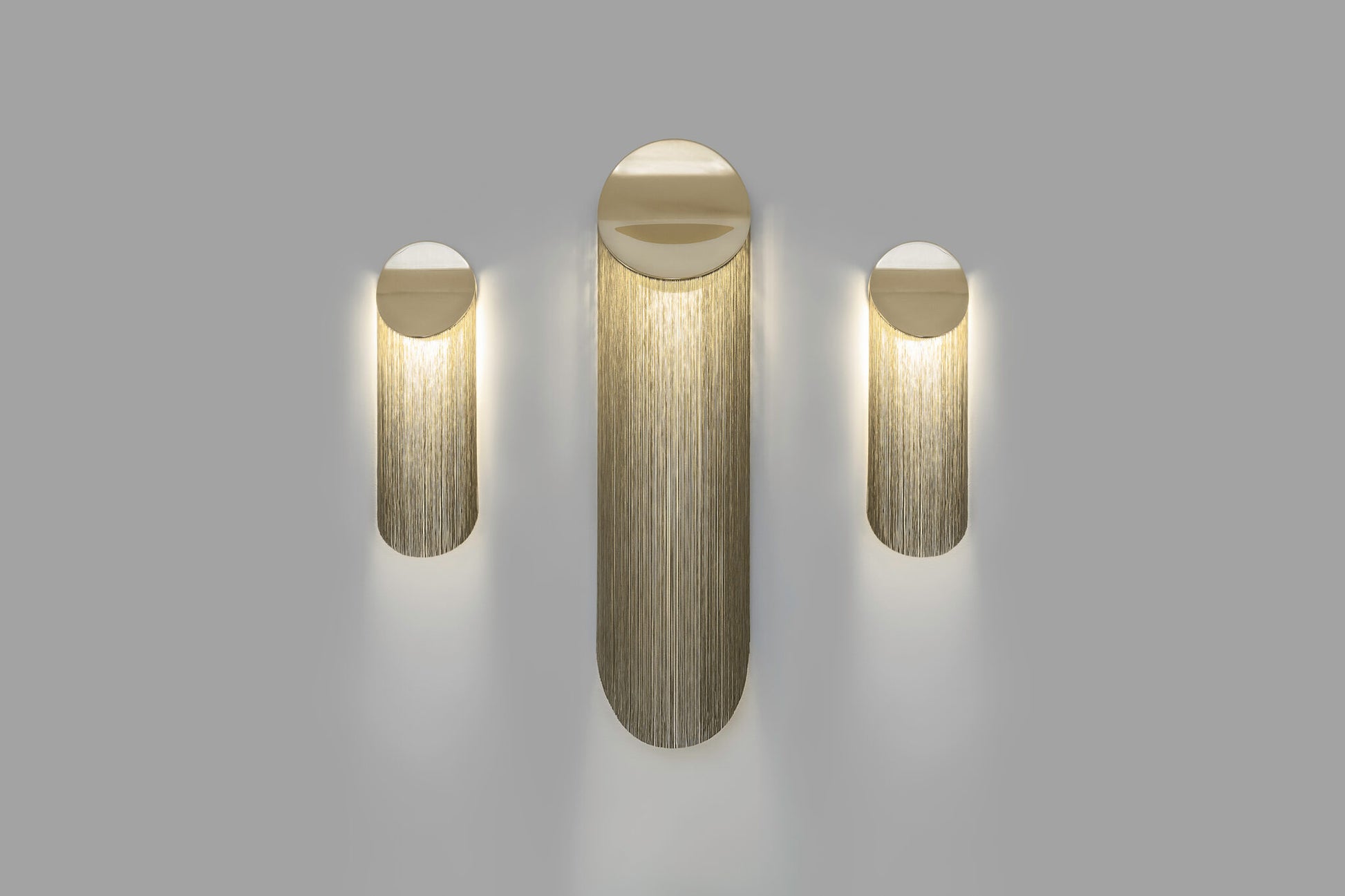 Cé jostles the obvious association between fringes and lighting by unveiling a classic revisited. The Cé Collection is inspired by Cécrops, who is believed to be the founder of Athens according to Greek mythology and would be the first native person. Spontaneously born from the earth itself, it was believed to be born half-snake half-man. The fringes recall the fluidity of the snake and the disc sends us back our reflection, bringing us back to our origins. Its anthropomorphic shape on the wall and the fringes that sift the light evoke a presence in the room. The Cé Wall honours the first nations.