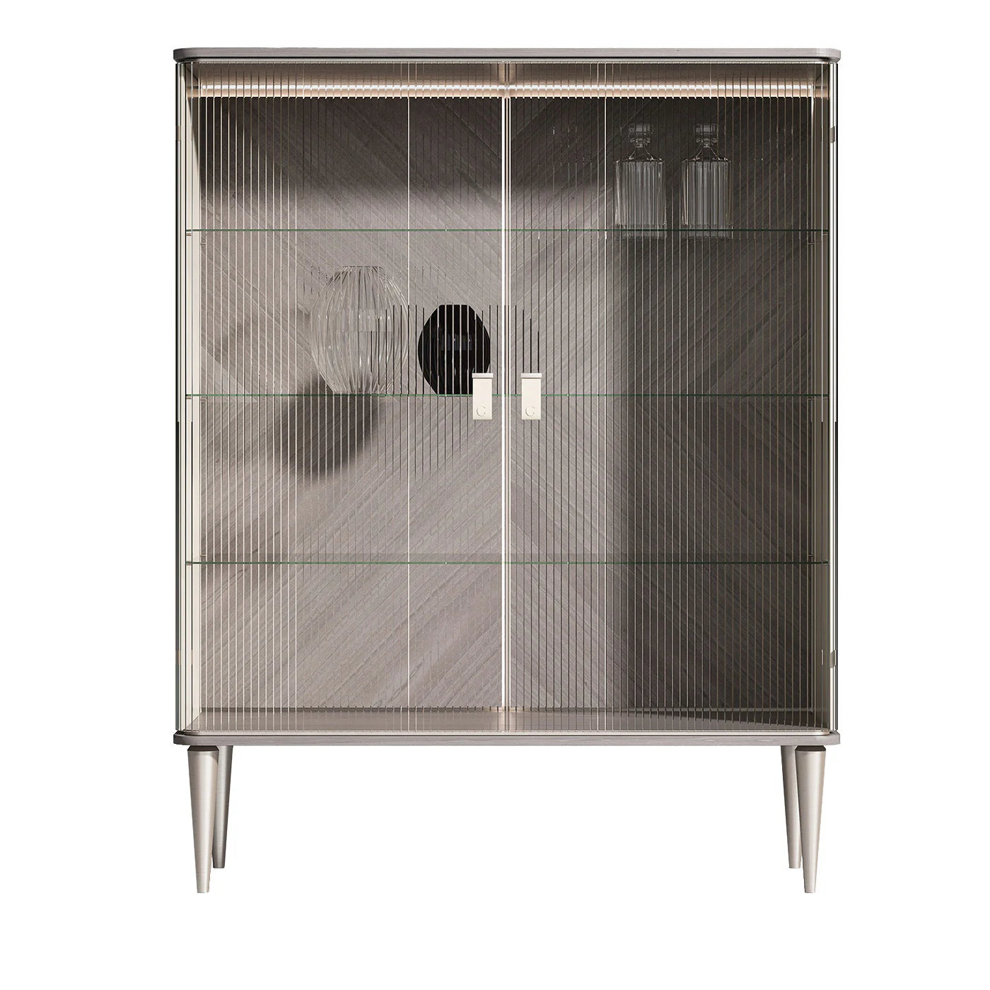 A remarkable union of expert craftsmanship and innovative aesthetic, this unique cabinet exudes elegance and sophistication. Standing on four conical wood feet with a gray finish, the lacquered beige wood cabinet features a sophisticated pattern with fluted shafts and two glass doors with etched vertical stripes. Internally, the piece has three glass shelves enhanced by the gray finish and recessed lights. An effortless piece of uncommon lightness and visual balance, this cabinet will shine in any living room, dining room, or study.