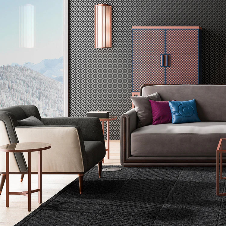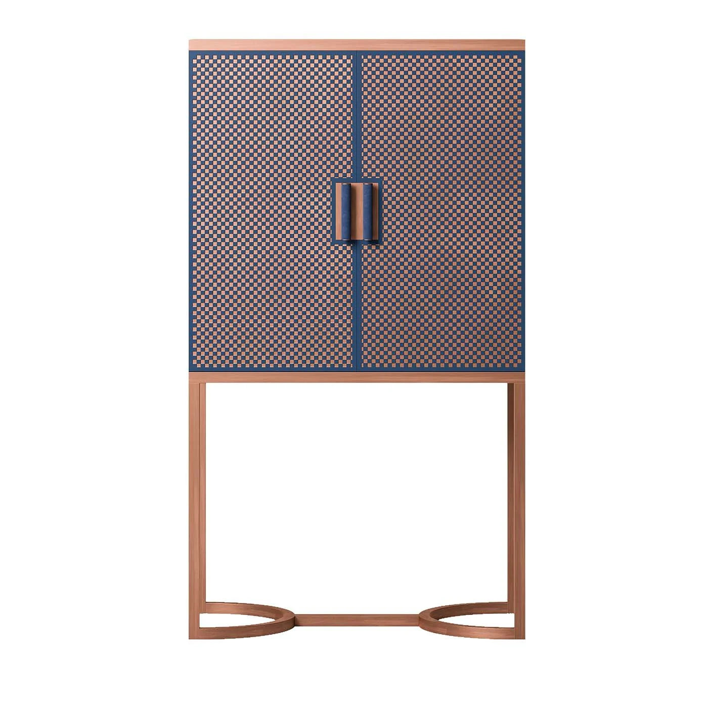 Combining aesthetic balance and functionality, the linear silhouette of this stunning bar cabinet will add bold personality and instant glamour to any living room. This striking piece rests on a trestle base with two semicircular sides crafted of metal with a brushed-copper finish that complement the engraved checkered copper/cerulean pattern of the top unit. The front doors open to reveal an ample storage space with ivory and blue lacquered panels with a mirrored back, a glass shelf, and two bottom drawers for the utmost display case