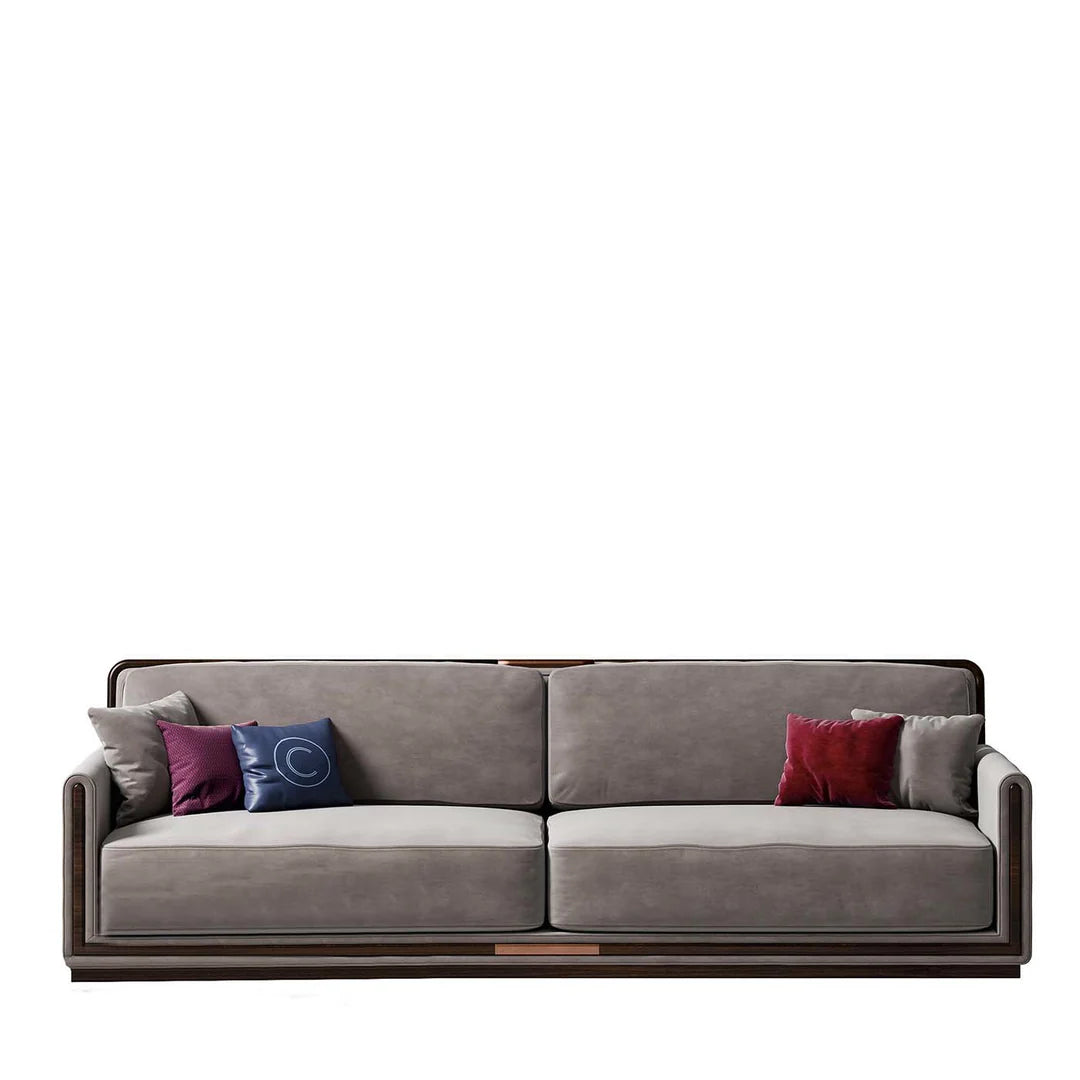 The sleek and modern design of this sofa will complement any interior, brightening a neutral ensemble or balancing a vibrant decor. The oversized cushions of seat and back are supported by a U-shaped frame featuring a wood insert along the entire profile, which gives it a distinctive mark and enhances the architectural silhouette. Upholstered in soft leather (cat. C) in a sophisticated dove-gray color, this dynamic sofa will bring elegance to an office decor or a contemporary living room.