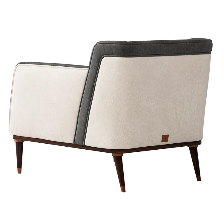 An effortless union of modern sensibility and traditional craftsmanship, this armchair exudes comfort and luxury with its deep seat and closed armrests. This elegant piece is upholstered on the inside with a plush fabric in a dark gray color (cat. E), while the exterior boasts a luxurious white nubuck leather (cat. C). A black leather accent follows the profile of the squared backrests extending to the lateral sides. With its elegant silhouette and neutral colors, this armchair will be a refined addition to a reading nook in a living room decor or a modern study.