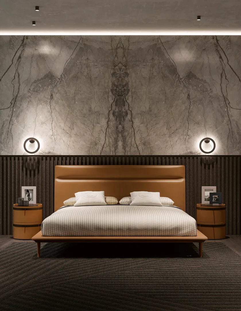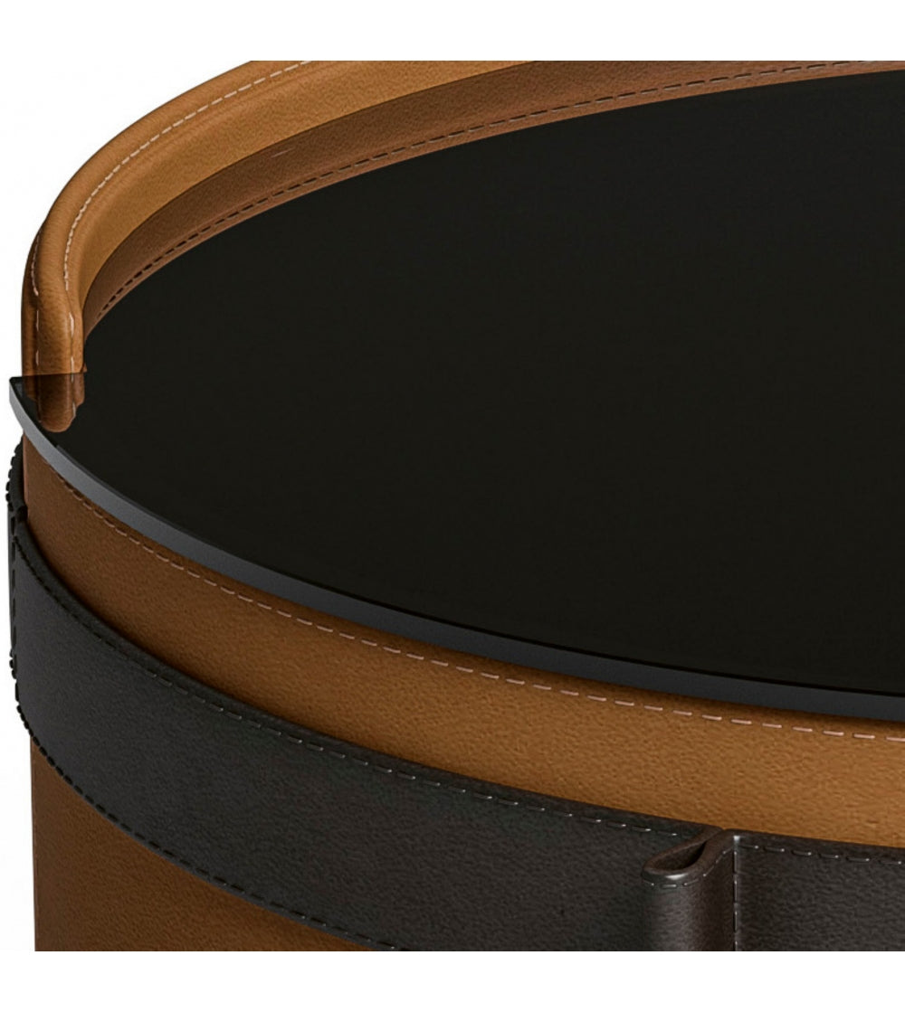 DRAGONFLY is a round nightstand with leather frame and glass top