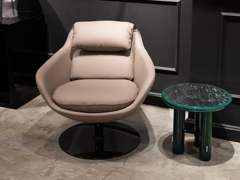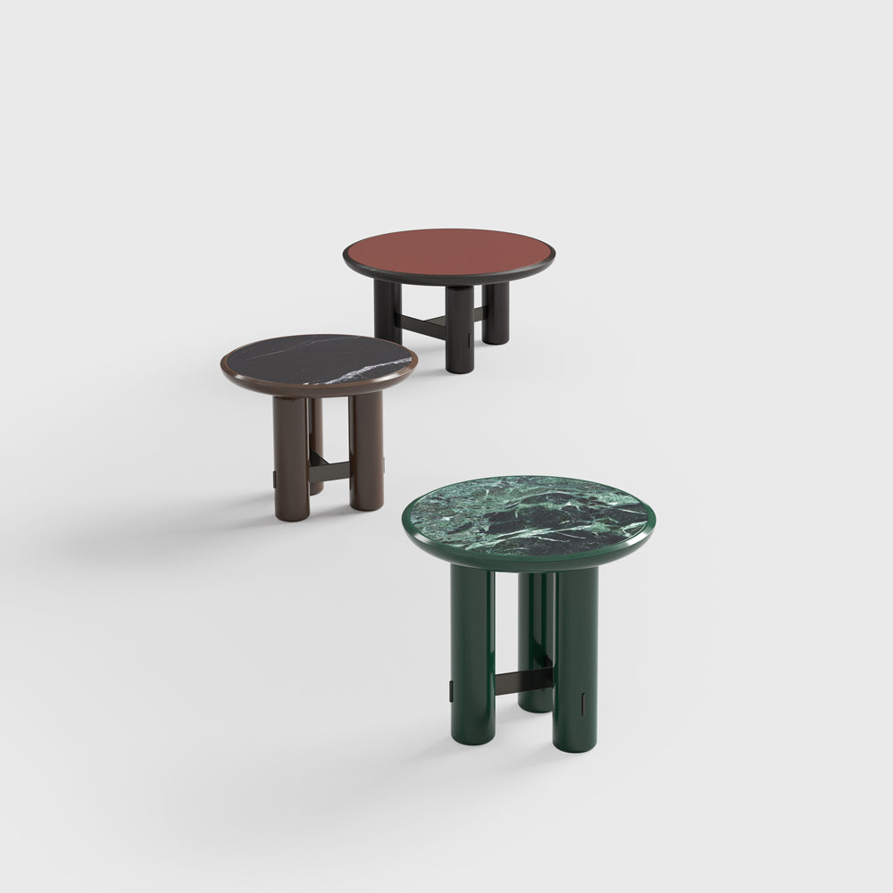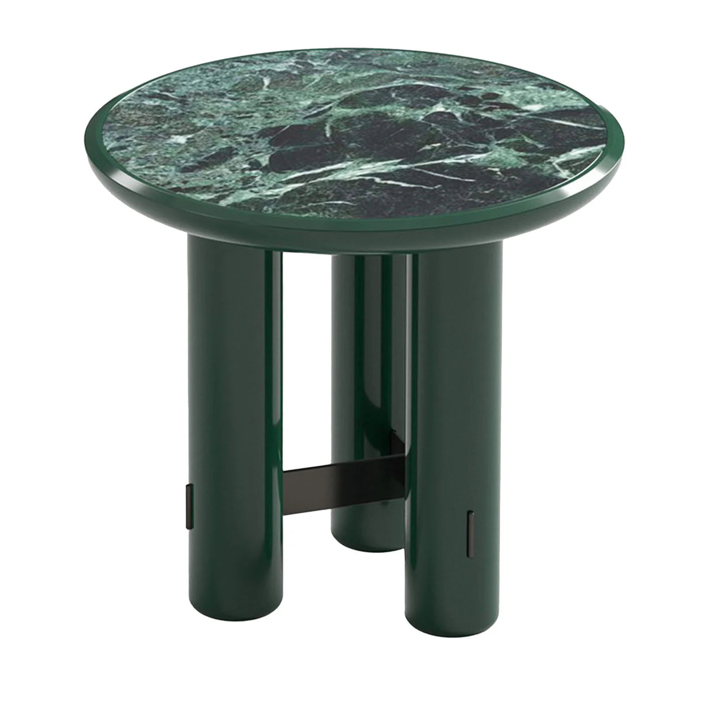 A medium-sized round coffee table featuring a glossy lacquered structure paired with a striking green marble top. The design is supported by three cylindrical legs connected by a horizontal beam, enhancing stability and visual appeal. Its combination of sleek lacquer finishes and natural marble makes it a refined addition to contemporary living spaces.