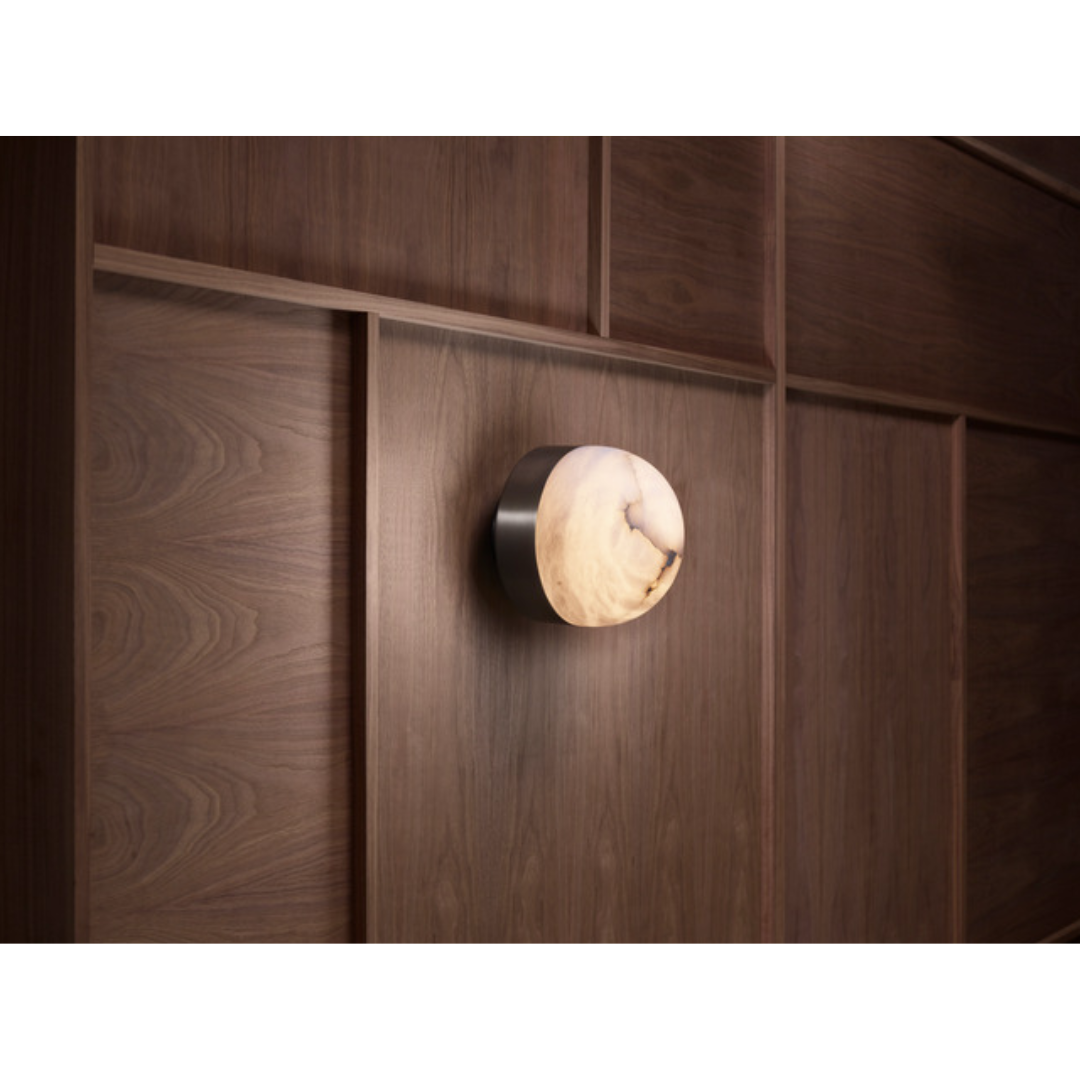 The Lucid Ceiling Light / Wall Sconce, designed by Michael Verheyden, is inspired by Parisian brasseries and snow domes, creating a sculptural and functional piece. The Honed Alabaster is natural and markings will vary. May be used on the wall or ceiling.