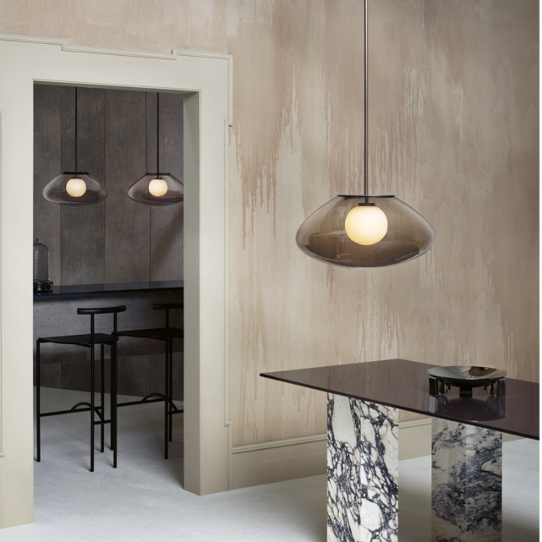 The Petra Pendant brings the natural world of delicacy and strength to your space. A soft core of molten hand shaped Smoked or Opal glass is complemented by an outer layer of thick pebble shaped glass tinted in a neutral pigment to create depth and form.