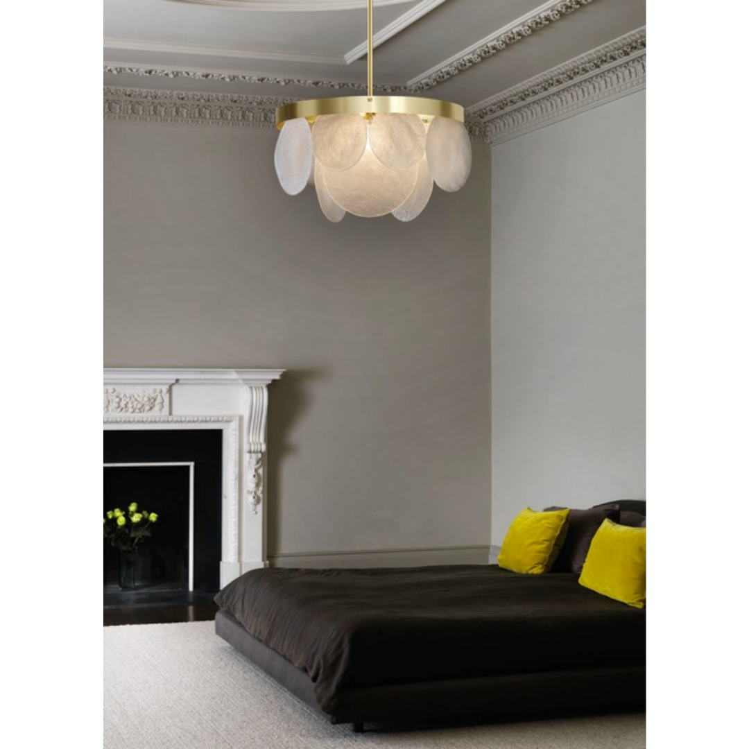 The Sasha Pendant emits a beautiful glow through the unique texture of fritted artisan glass discs. The droplets are hand formed using a process creating crystal like textures.