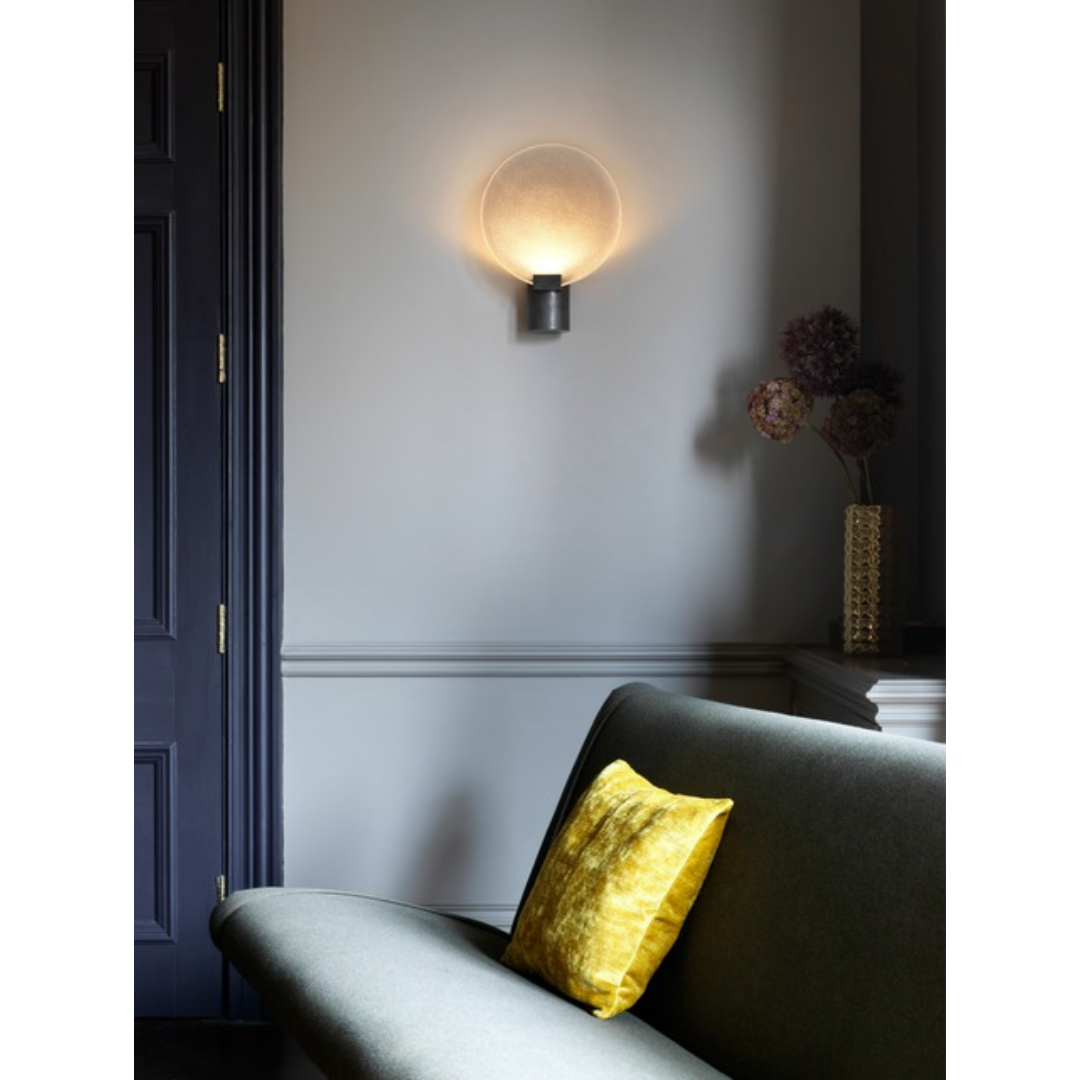The Nimbus Wall Sconce offers a unique look that blends retro and modern design to together to create a piece that is chic and will suit a number of interiors. Featuring a hand formed glass droplet set into a metal wall bracket that conceals the light source. UL listed. ADA compliant. Made in England. Includes 4.5 inch square junction box cover (not pictured).