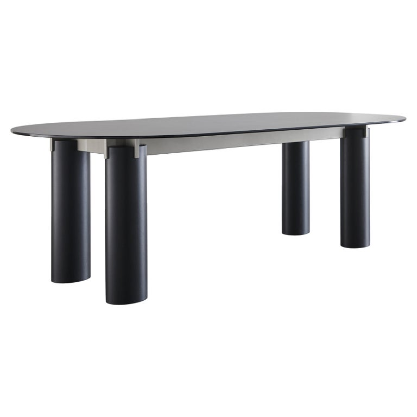 Oval table, fixed top available in the following options: 6 mm porcelain stoneware combined with 6 mm bronze-coloured glass; 12 mm glass painted; white Carrara marble top 20 mm. Lacquered MDF wood feet. Glossy lacquered steel frame.
