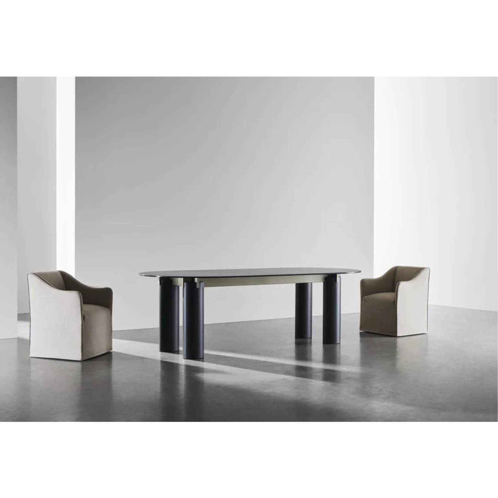 Oval table, fixed top available in the following options: 6 mm porcelain stoneware combined with 6 mm bronze-coloured glass; 12 mm glass painted; white Carrara marble top 20 mm. Lacquered MDF wood feet. Glossy lacquered steel frame.
