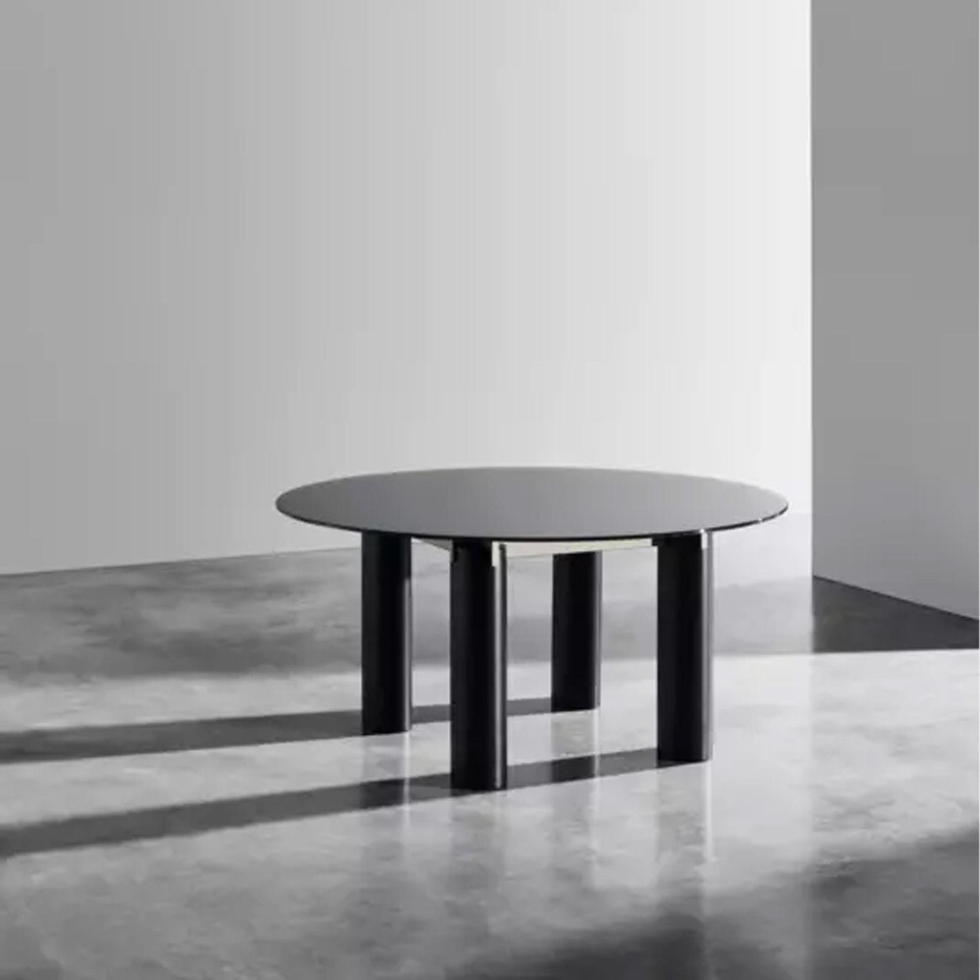 Round table, fixed top available in the following options: 6 mm porcelain stoneware combined with 6 mm bronze-coloured glass; 12 mm glass painted; white Carrara marble top 20 mm. Lacquered MDF wood feet. Glossy lacquered steel frame.
