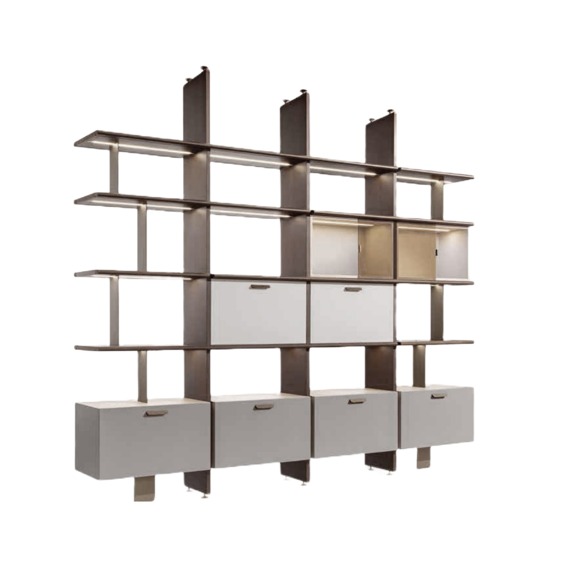 M is a floor-ceiling mounted bookcase with integrated lighting, designed by Carpanese Home, made of Canaletto walnut and equipped with drop-down doors, painted wood, and sliding doors in bronzed glass. Duo is available in three sizes.