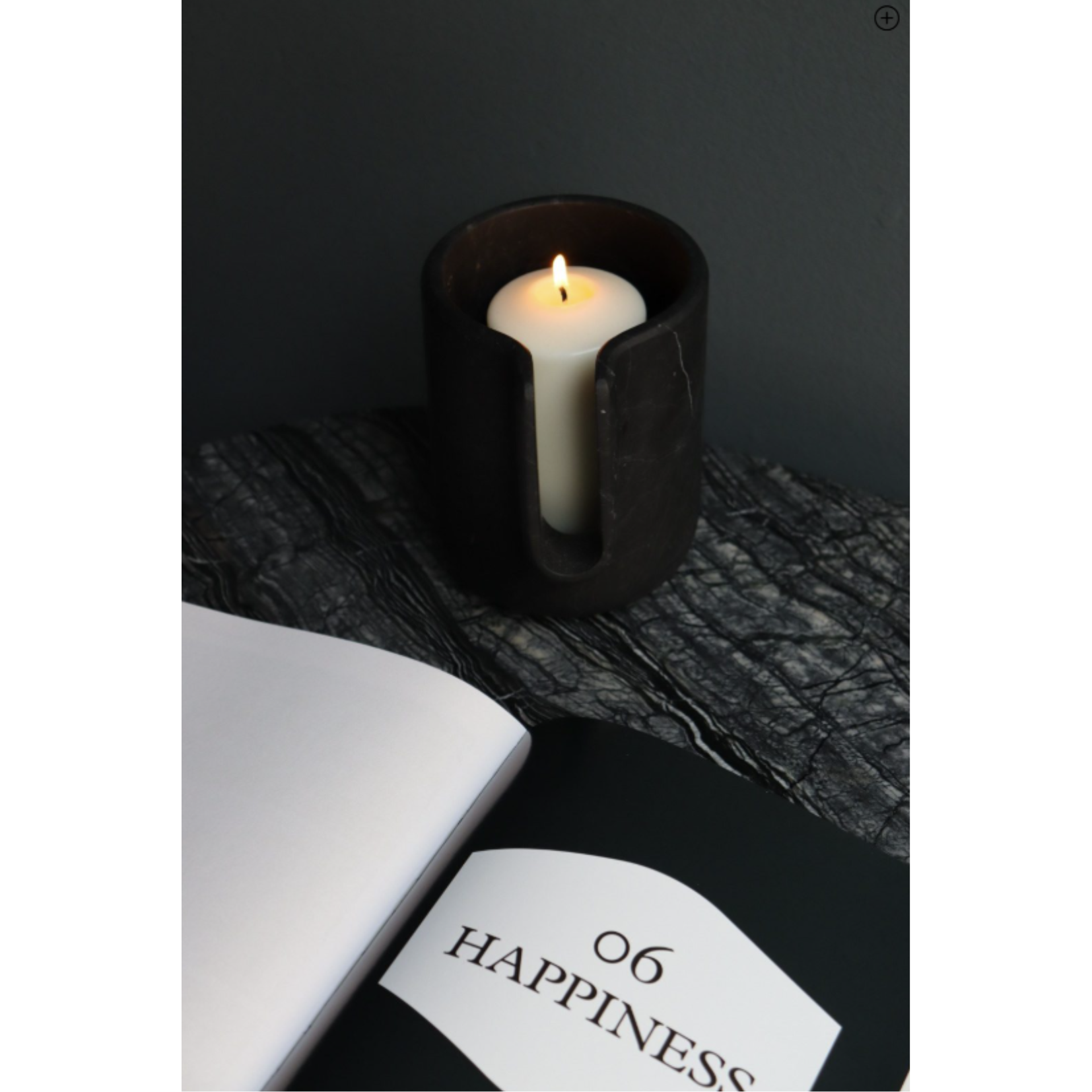 ritual of lighting a candle. Kouki (Kou – meaning light in Japanese- and Ki – sheen/shine) is a marble tray that gathers a series of elements gravitating around the main protagonist, the candle. The candle is contained in a marble cylinder which presents a central cut to facilitate itslighting. Other precious elements completethe set such as a match holder, a wick trimmer, a container for used matches and a snuffer to extinguish the flame. All items are placed in a specific position and have their purpose. The concept behind Kouki relates to the substantial purity of things with a focus on removing rather than adding, coherently