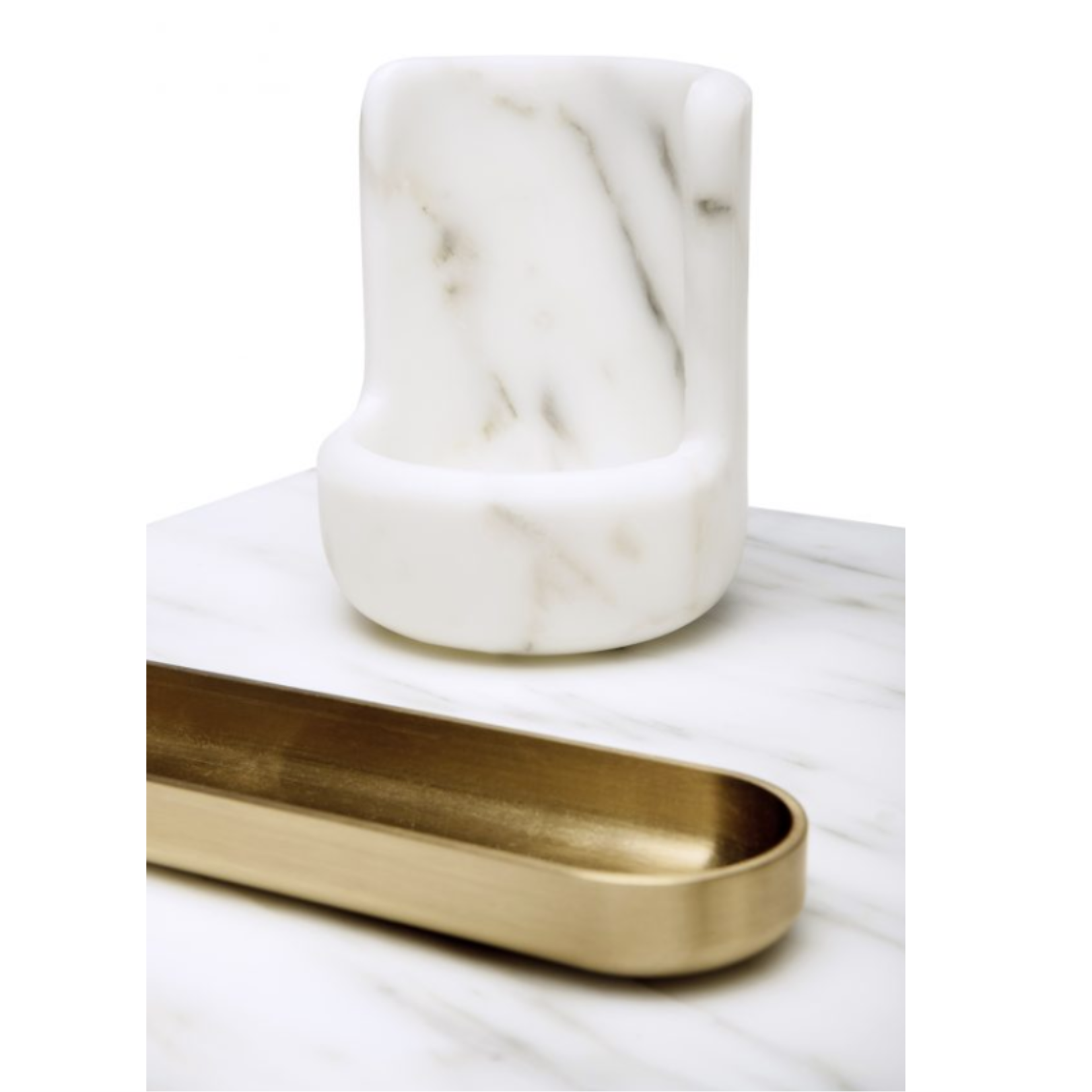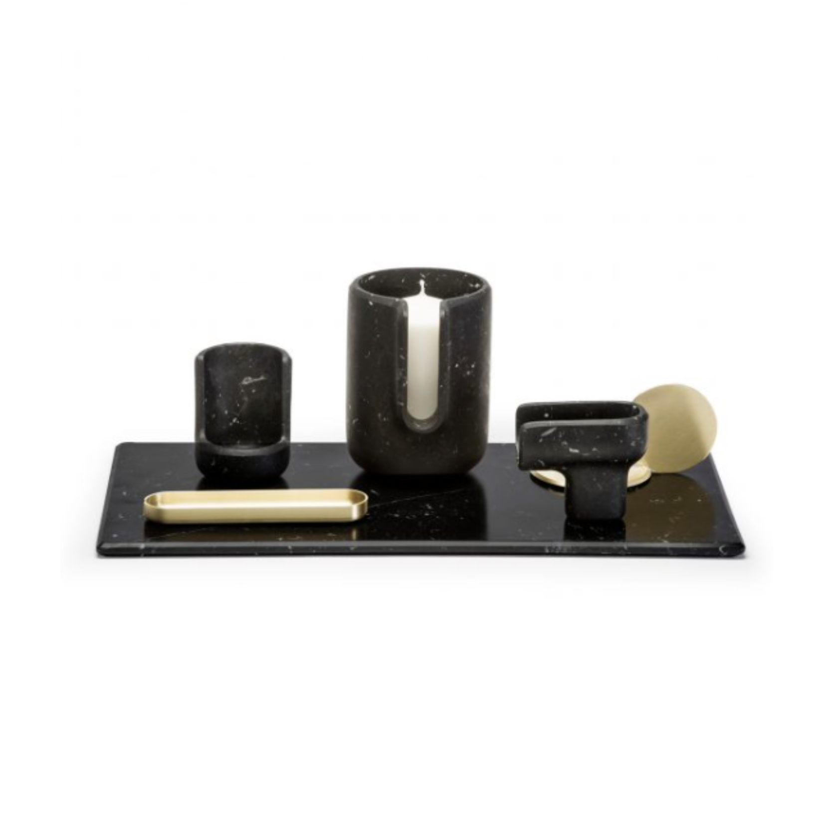 Kouki is a project that reveals Oki Sato’s emotional and intellectual interpretation of the ritual of lighting a candle. Kouki (Kou -meaning light in Japanese- and Ki – sheen/shine) is a marble tray that gathers a series of elements gravitating around the main protagonist, the candle. The candle is contained in a marble cylinder which presents a central cut to facilitate its lighting. Other precious elements complete the set: a match holder, a wick trimmer, a container for used matches and a snuffer to extinguish the flame. All items are placed in a specific position and have their own purpose. The concept behind Kouki relates to the substantial purity of things with a focus on removing, rather than adding, coherently reaffirming Nendo’s distinctive approach.