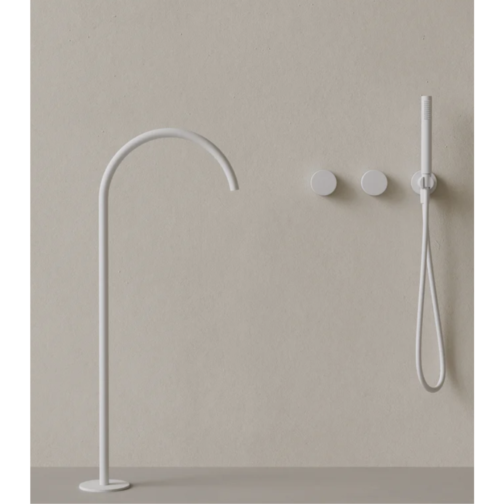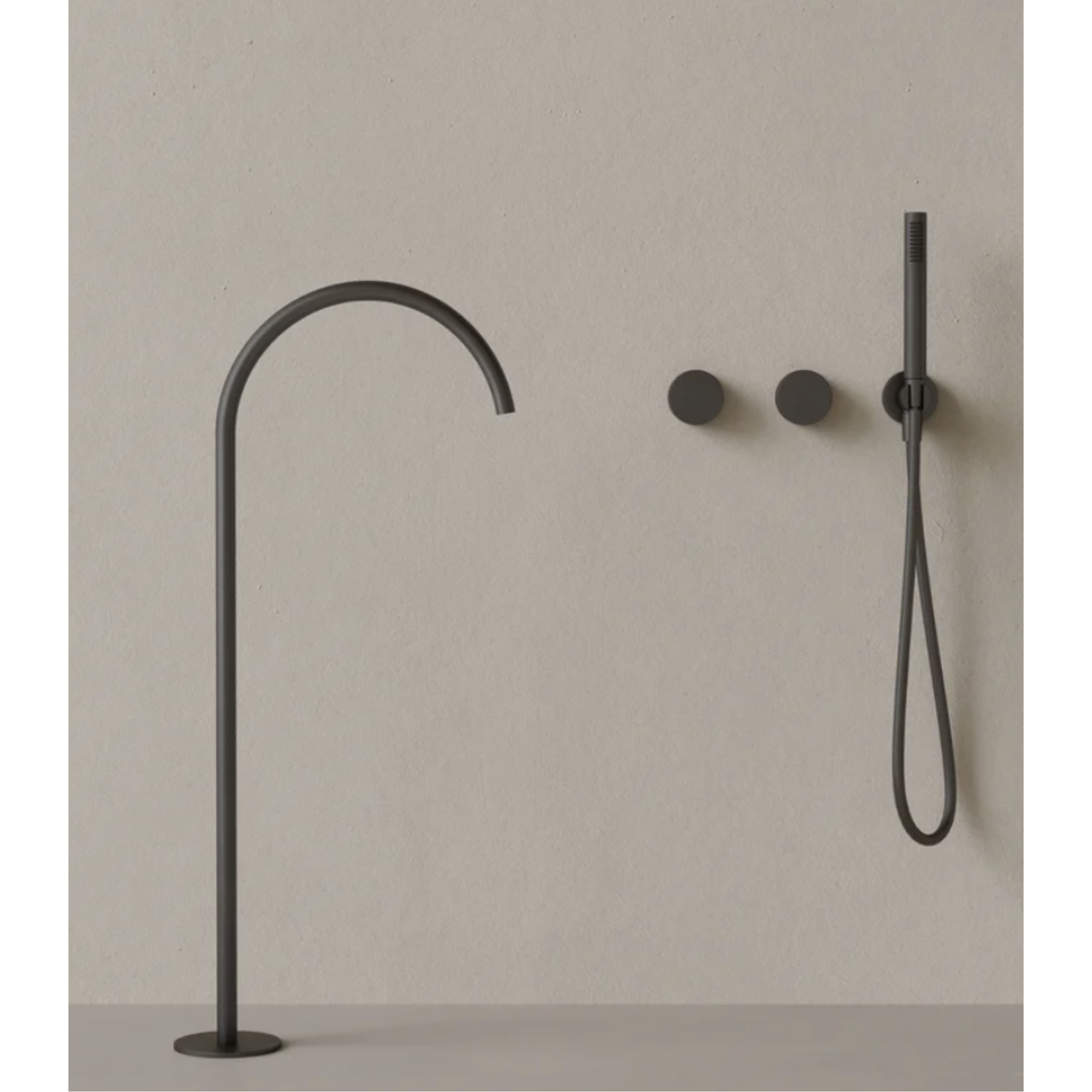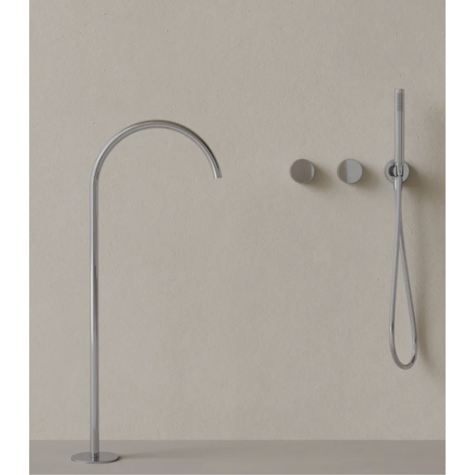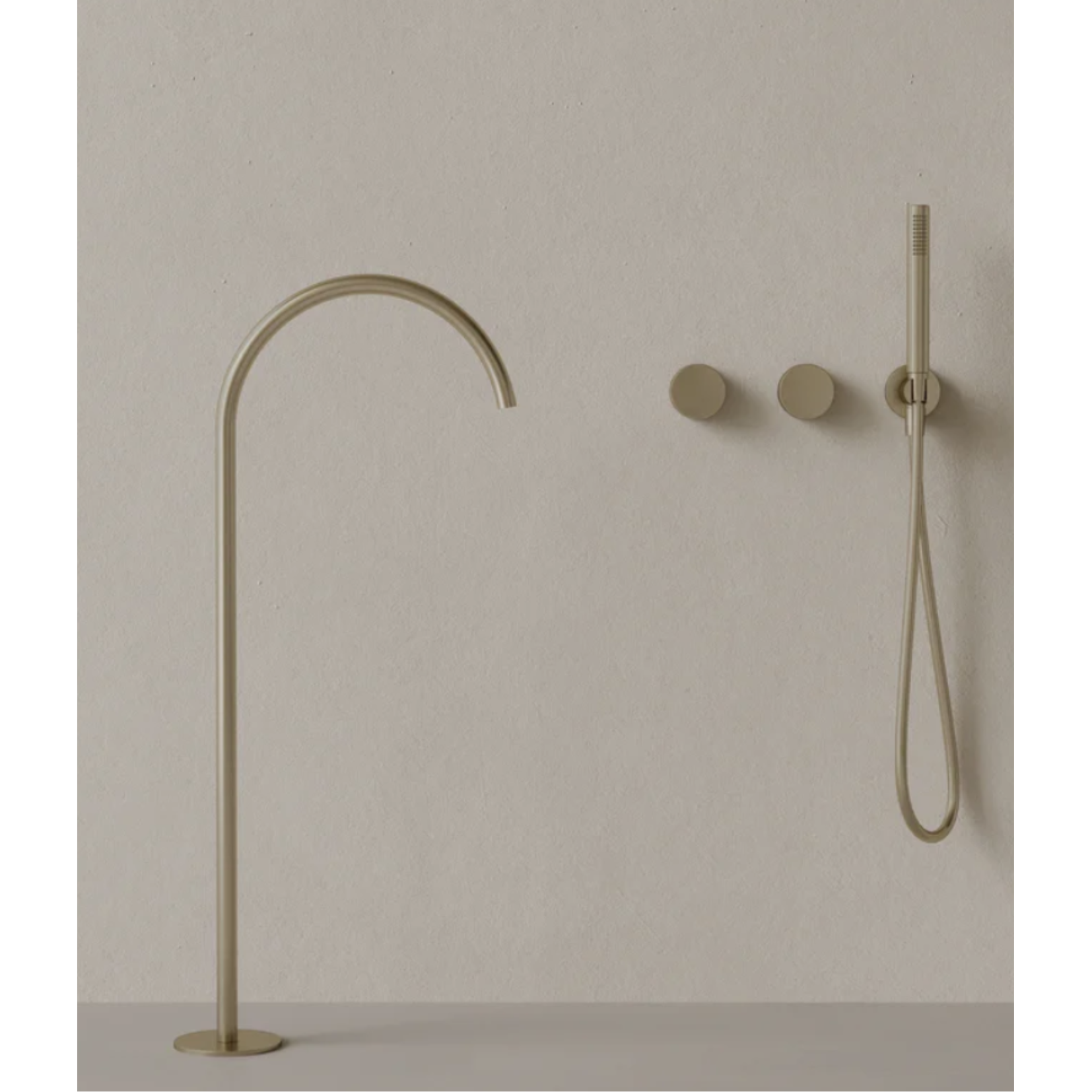 This floor-mounted bathtub filler features a sweeping high arc spout that adds fluidity and presence to the bathing space. Dual knob controls offer precise water and temperature adjustment, while the handheld provides added convenience. Designed for control and ease, it allows for an uninterrupted, restorative soak.