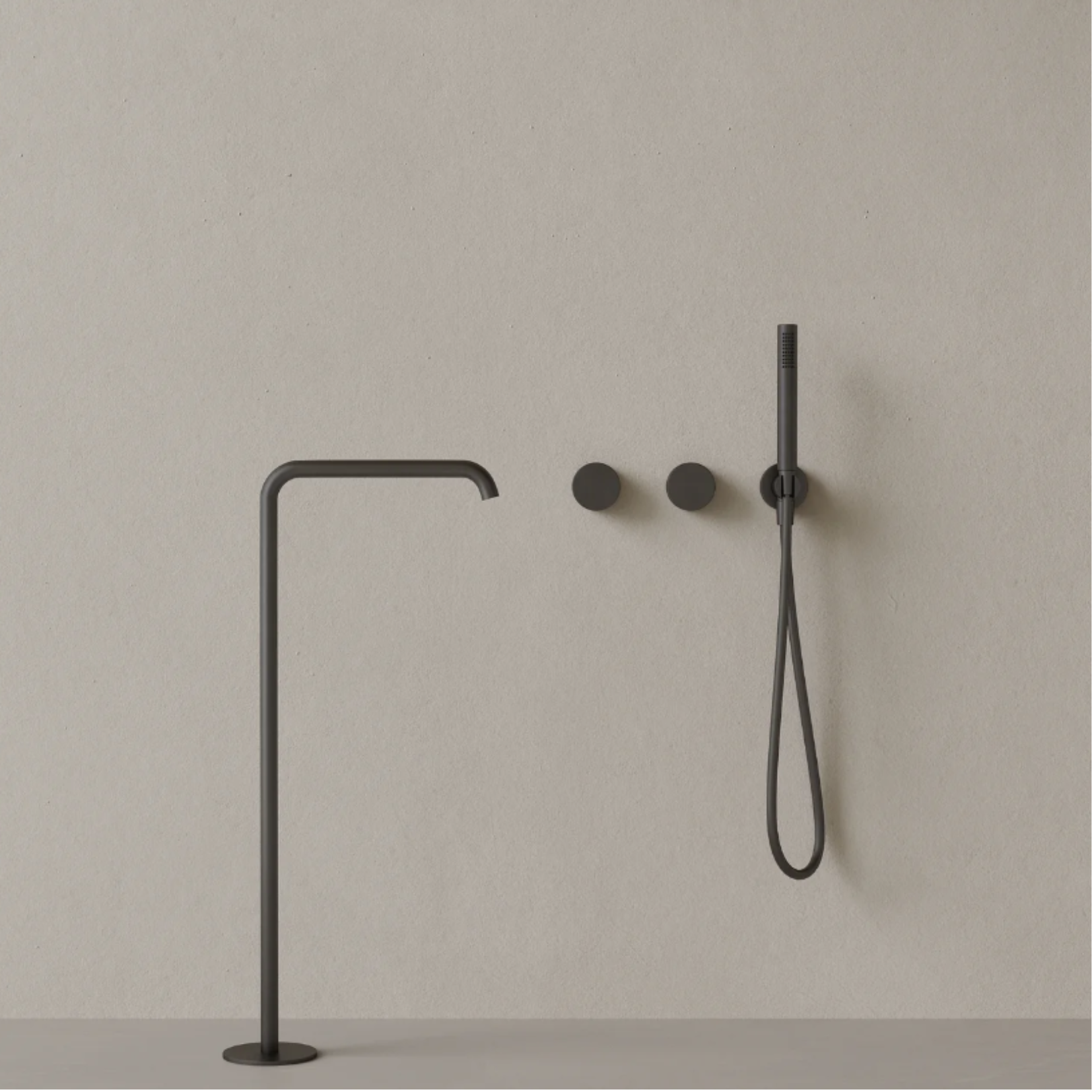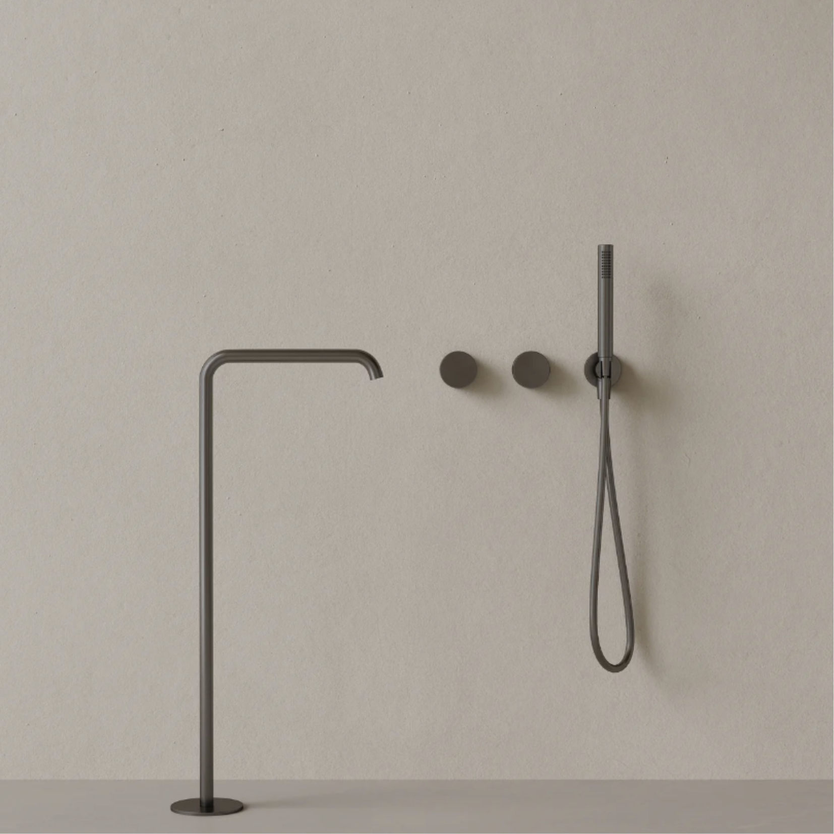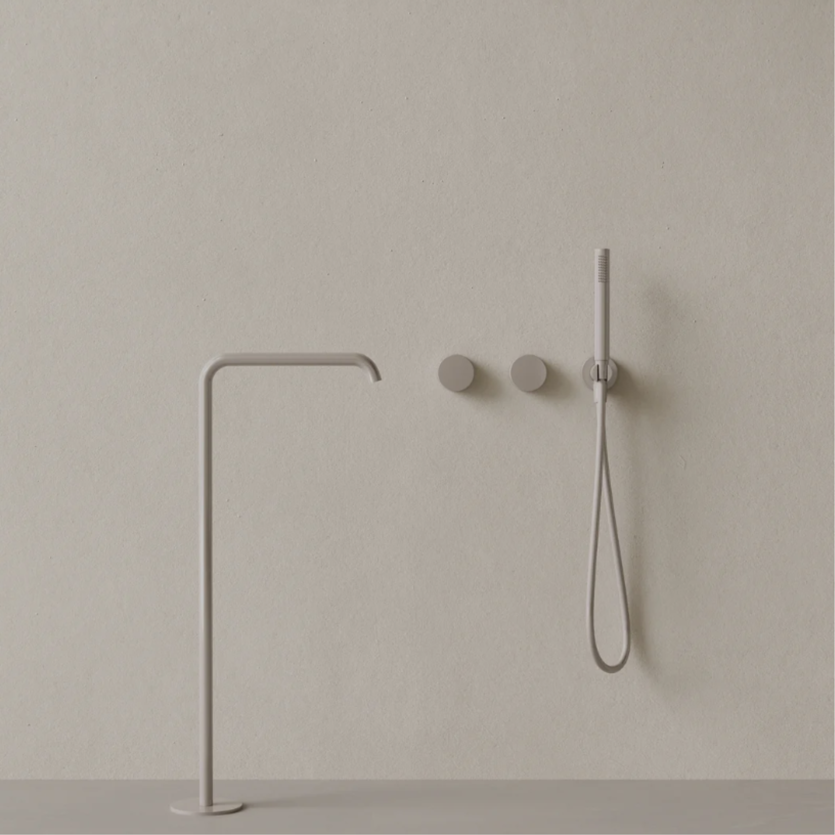With its softened square profile and rounded corners, this floor-mounted bathtub filler brings a contemporary sense of ease to architectural form. The gently curved silhouette lends a balanced, welcoming presence, while dual knob controls ensure precise water and temperature regulation. An integrated handheld enhances versatility for daily rituals. Designed for intuitive use and visual harmony, it supports an uninterrupted, restorative soak.