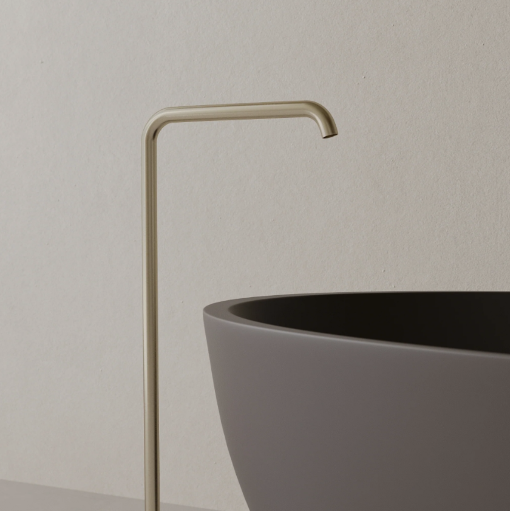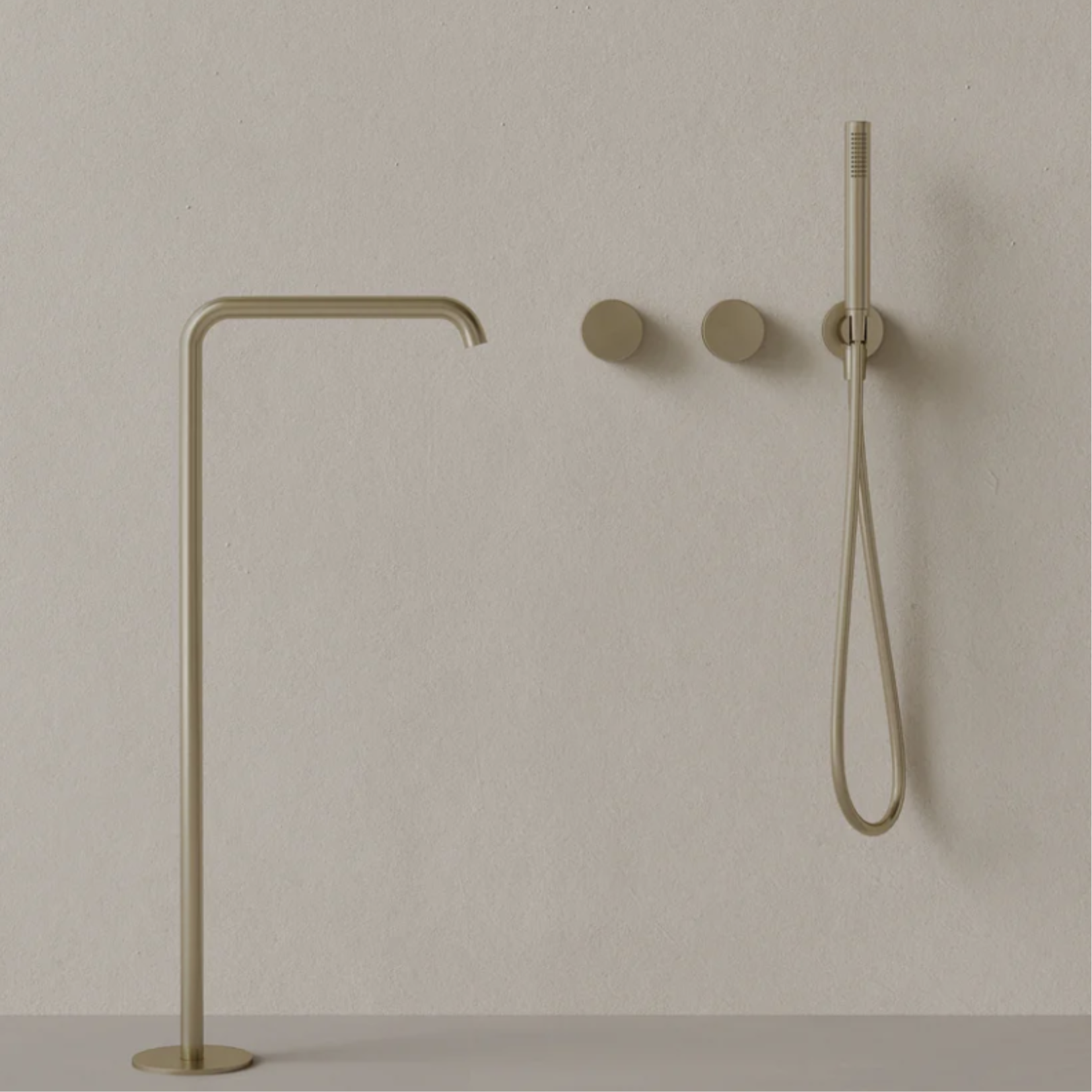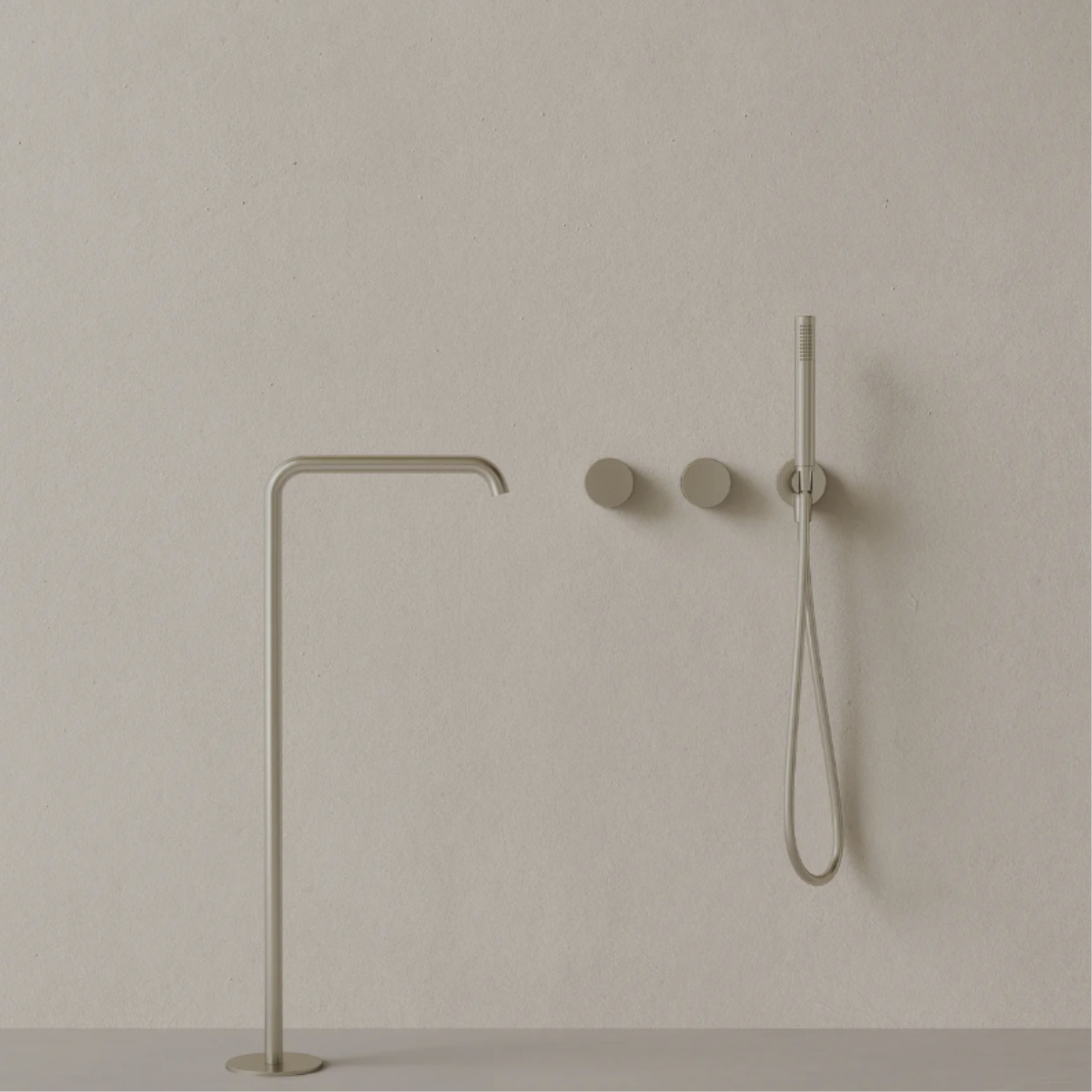 With its softened square profile and rounded corners, this floor-mounted bathtub filler brings a contemporary sense of ease to architectural form. The gently curved silhouette lends a balanced, welcoming presence, while dual knob controls ensure precise water and temperature regulation. An integrated handheld enhances versatility for daily rituals. Designed for intuitive use and visual harmony, it supports an uninterrupted, restorative soak.