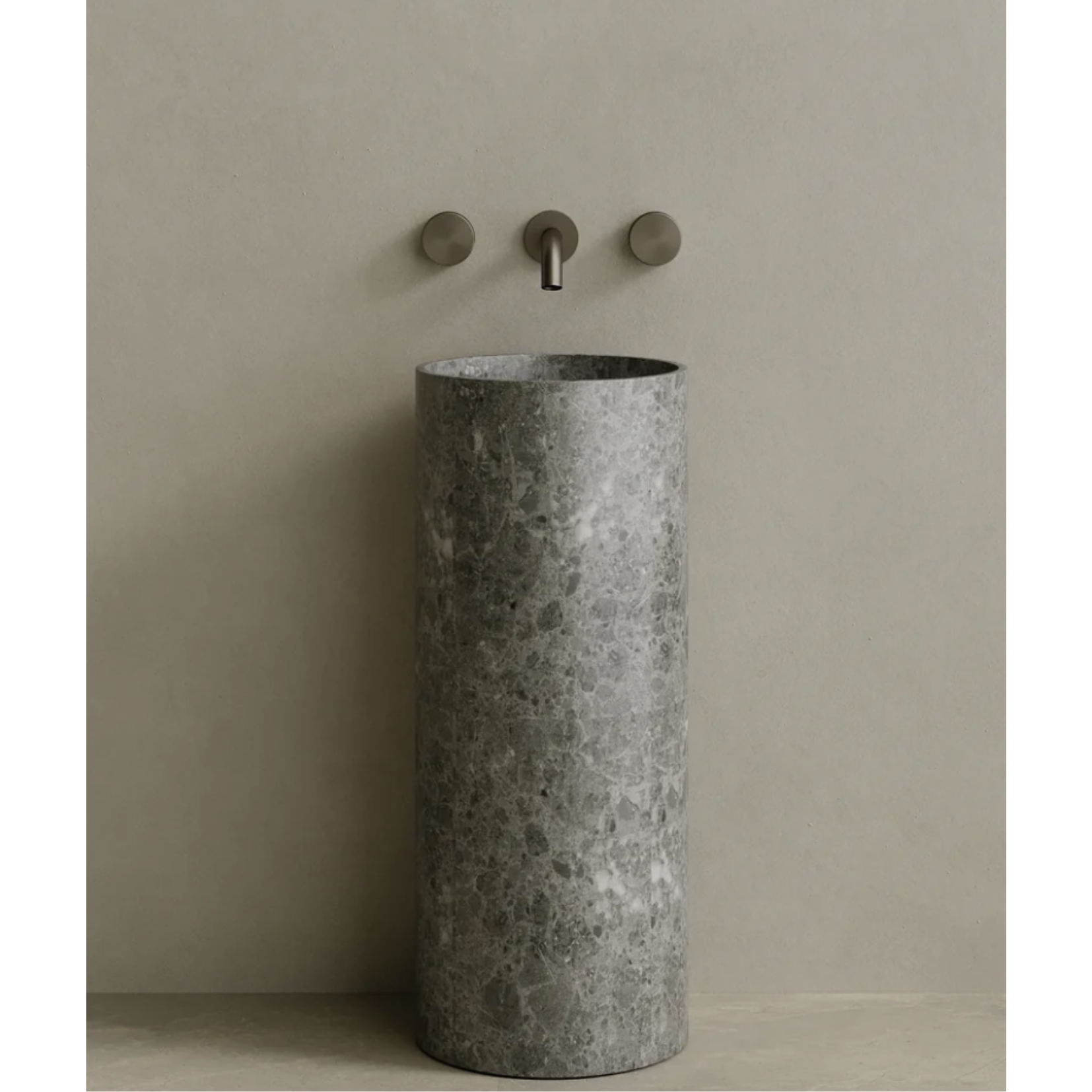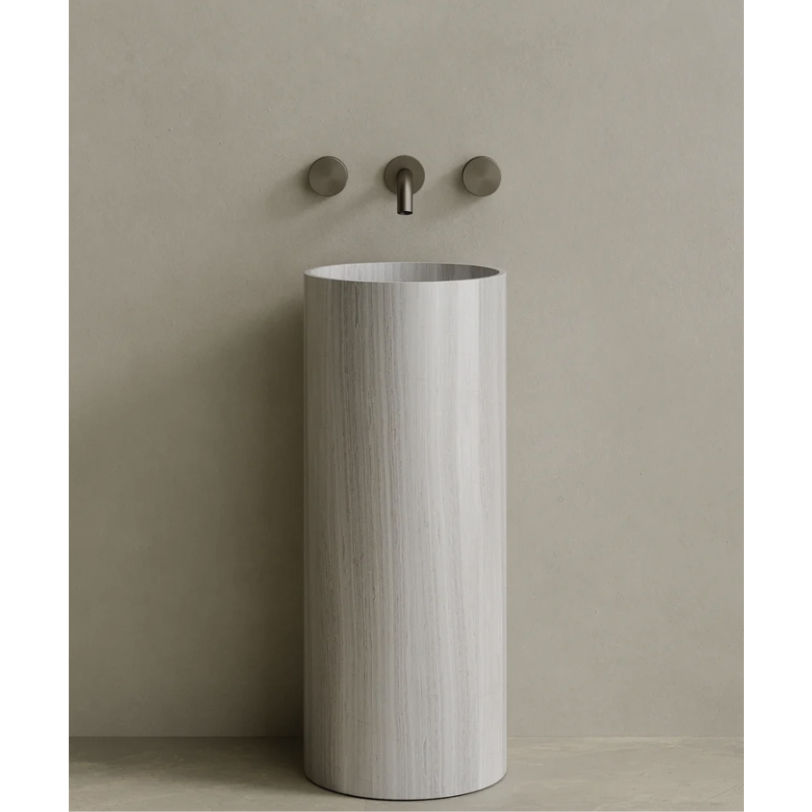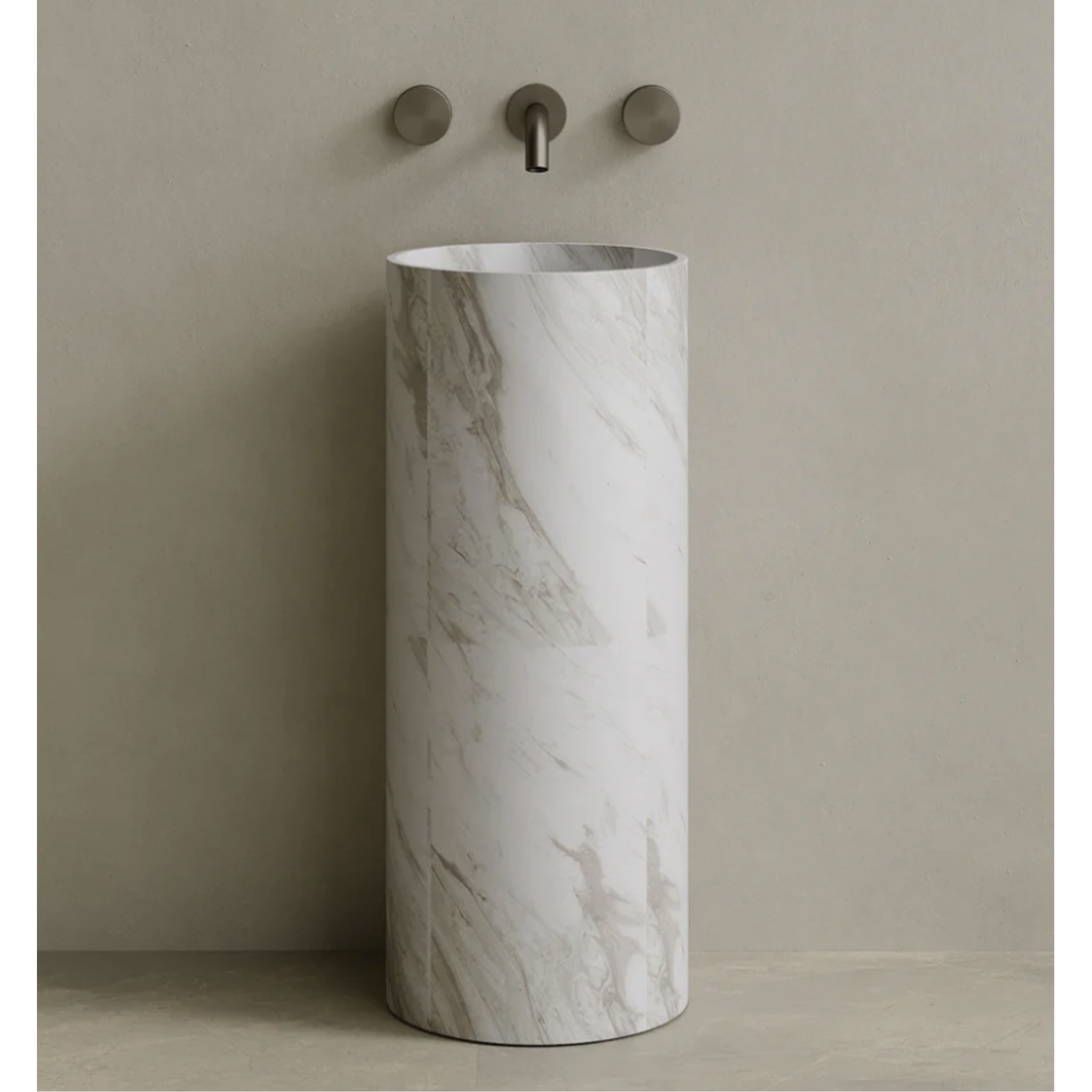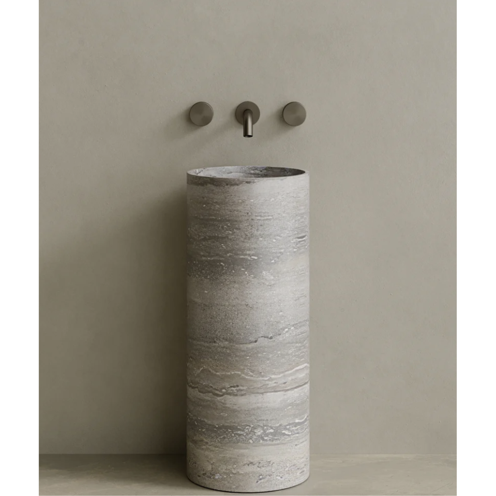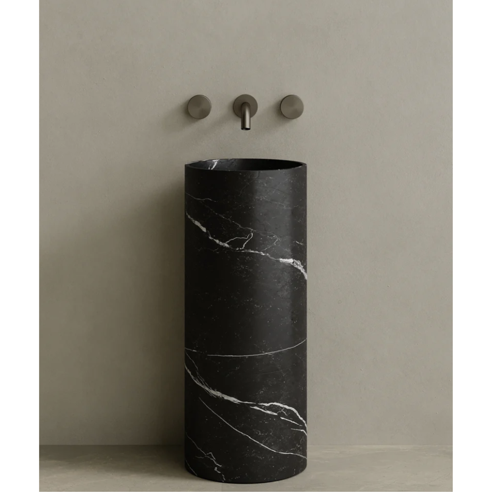 The Colva Freestanding Pedestal Sink introduces a refined sculptural silhouette with its slim, rounded form and minimalist profile. Hand-carved from natural stone, this monolithic sink offers a fluid presence and smooth surface, making it an understated yet impactful addition to any contemporary bath space.