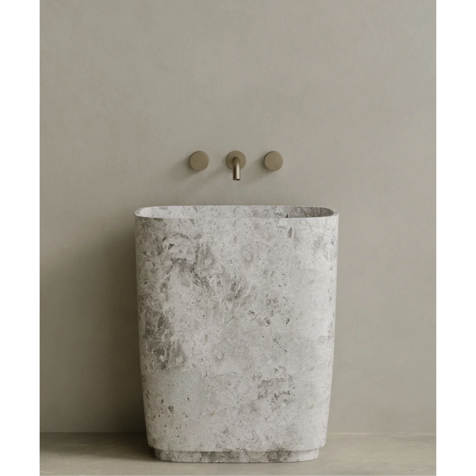 The Ovola Freestanding Pedestal Sink captures sophistication with its softened oval form and curved basin. Handcrafted from solid stone, this monolithie sink introduces a gentle organic presence. Its seamless surface and sculptural silhouette offer a grounded, modern centerpiece for the contemporary bath.