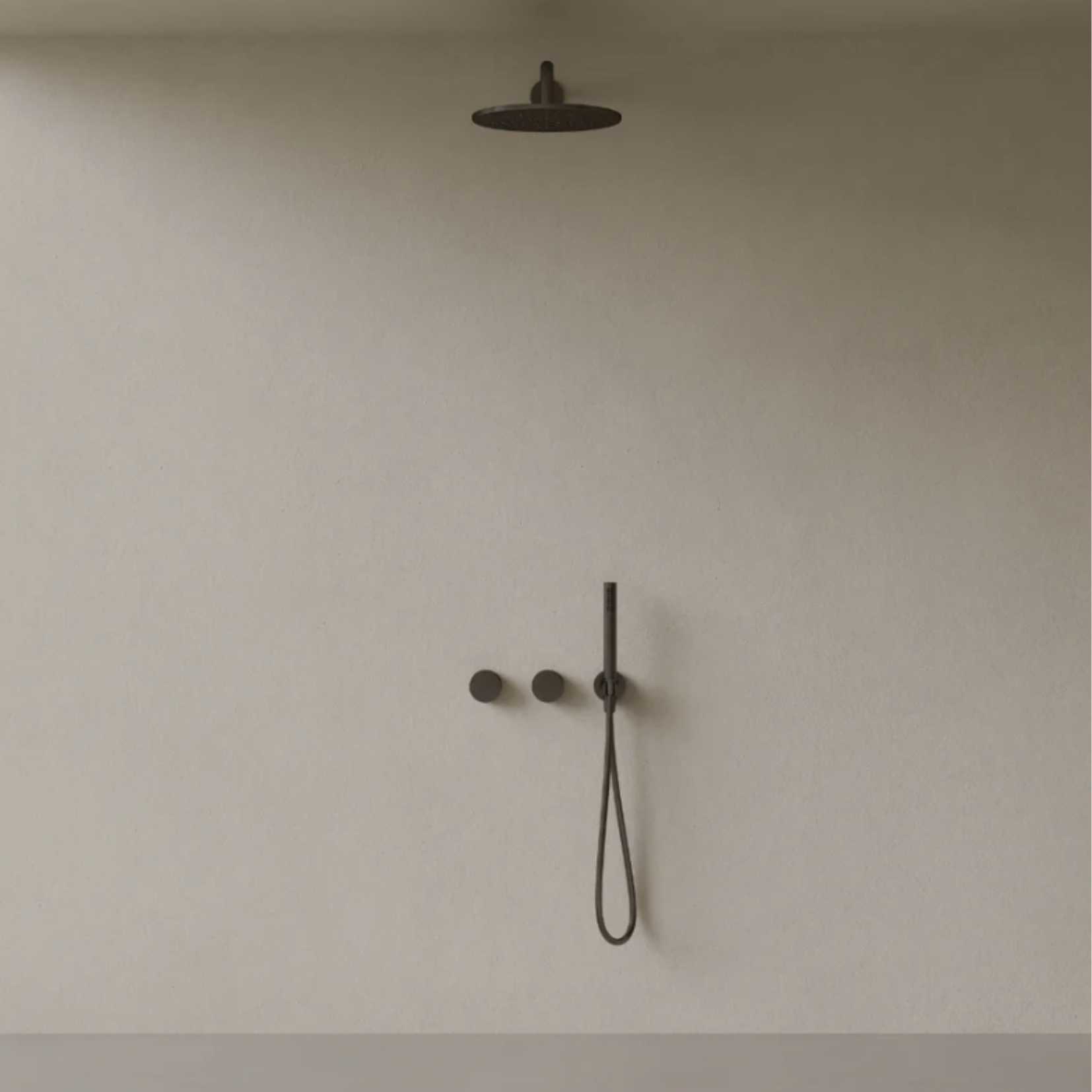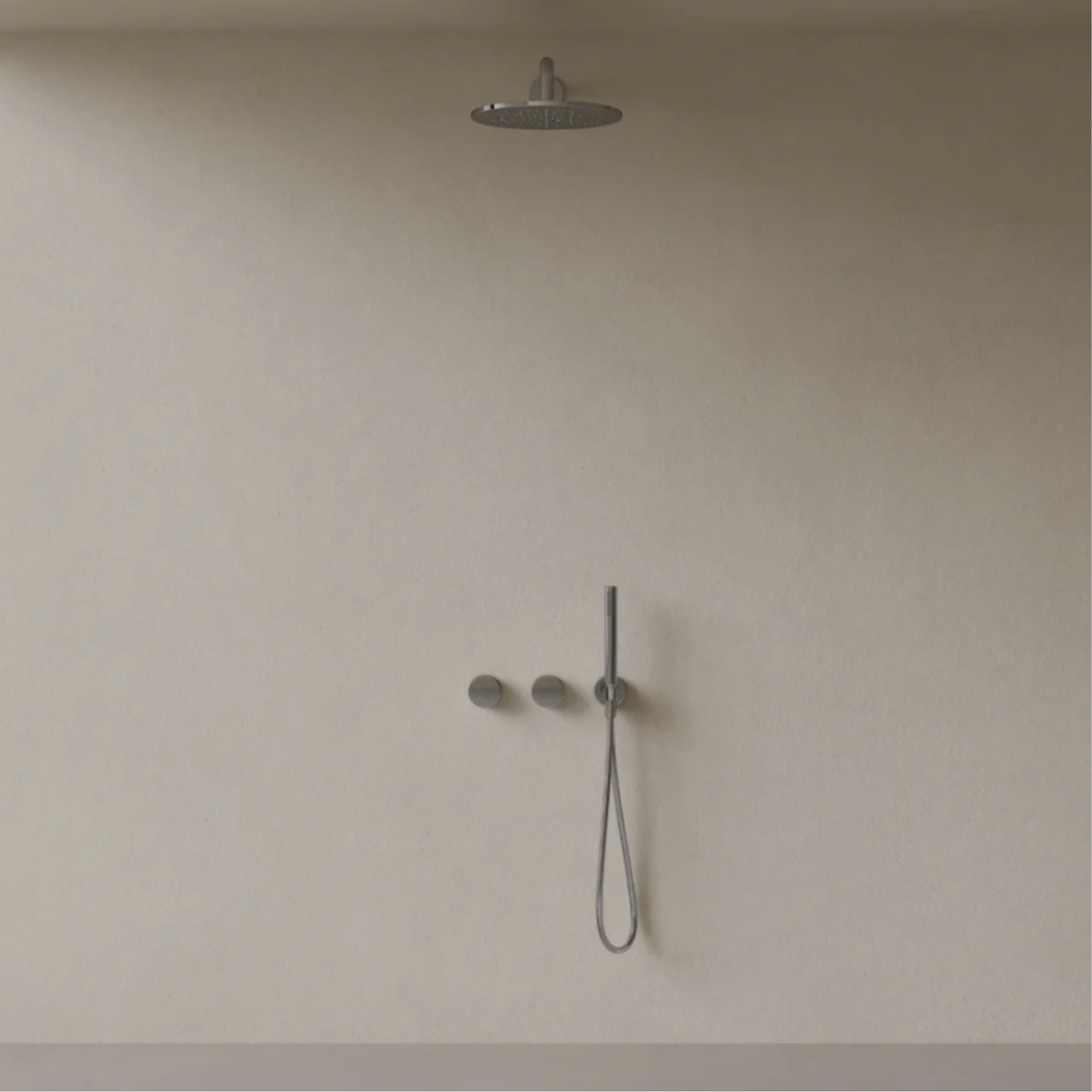 This thermostatic shower system is designed for consistency and ease, with a curved arm and round rainfall head that deliver steady, uniform coverage. Dual knob controls allow for precise temperature adjustment and smooth transitions to the handheld. The experience is quiet and composed—focused on comfort, control, and considered design.