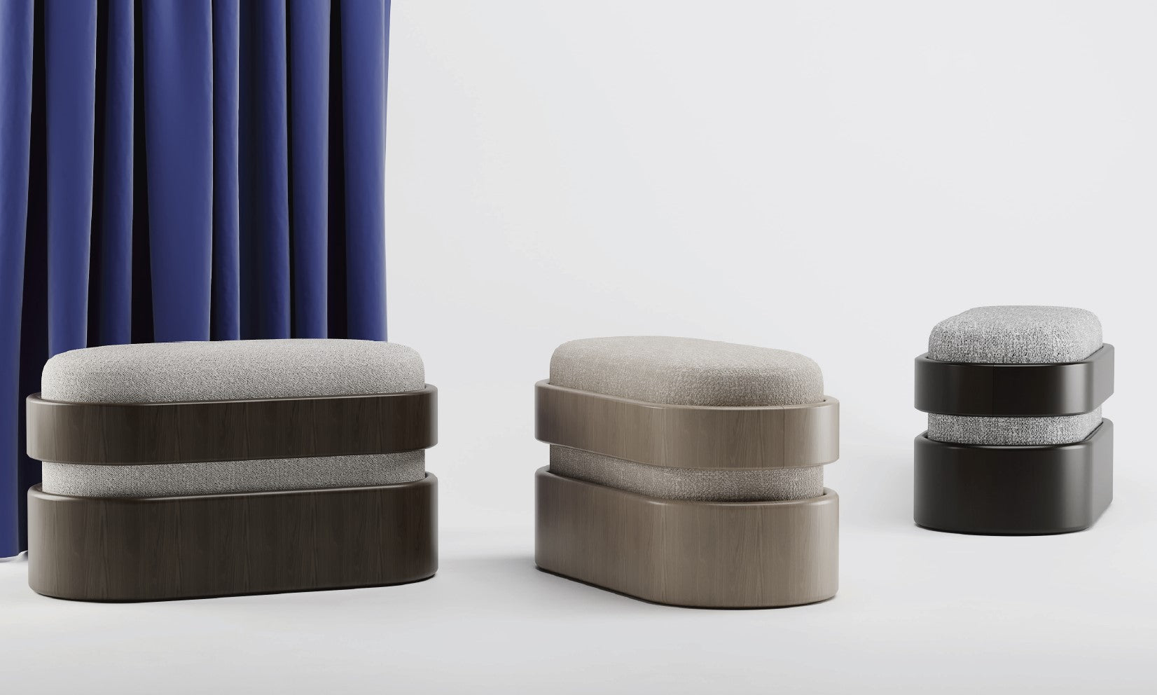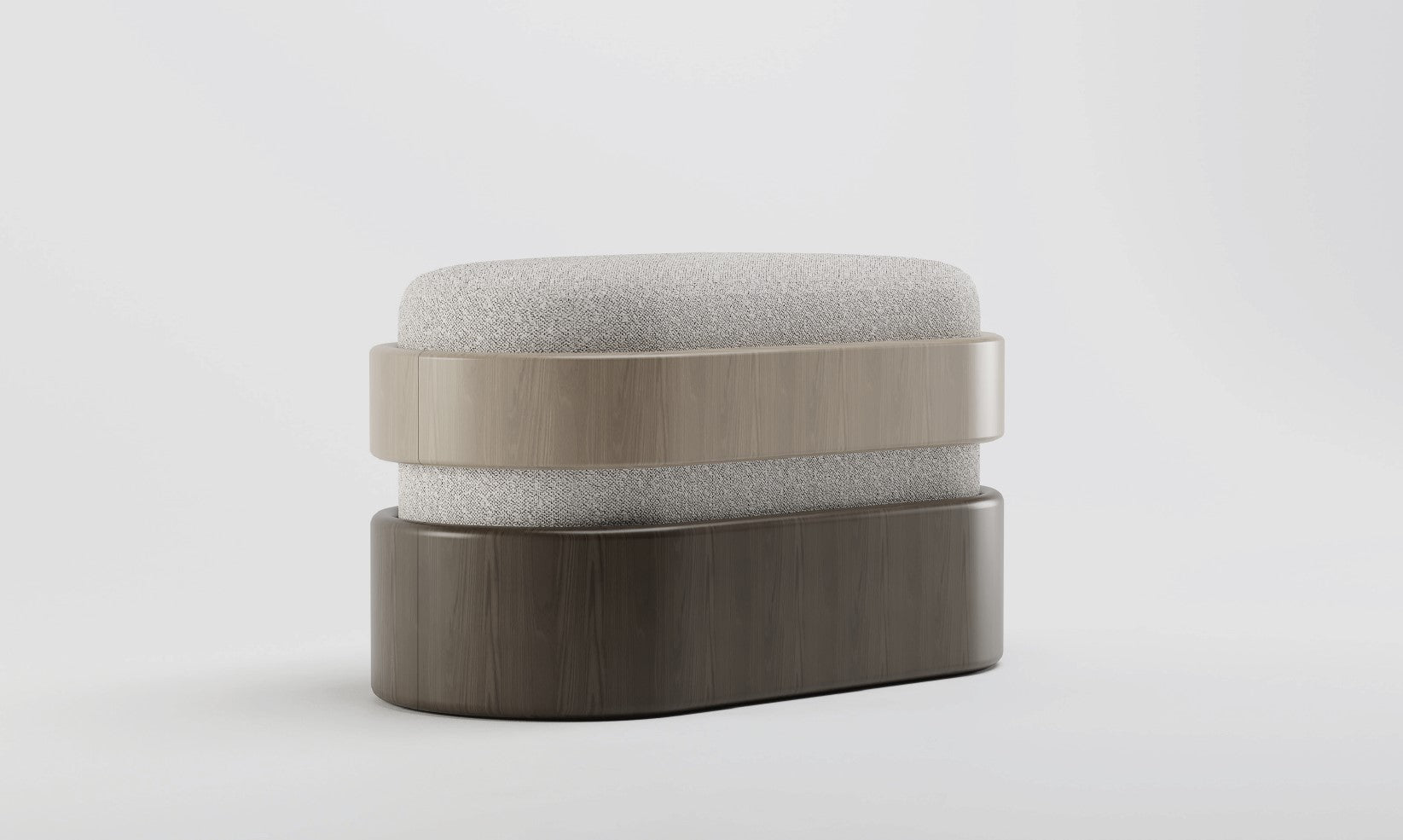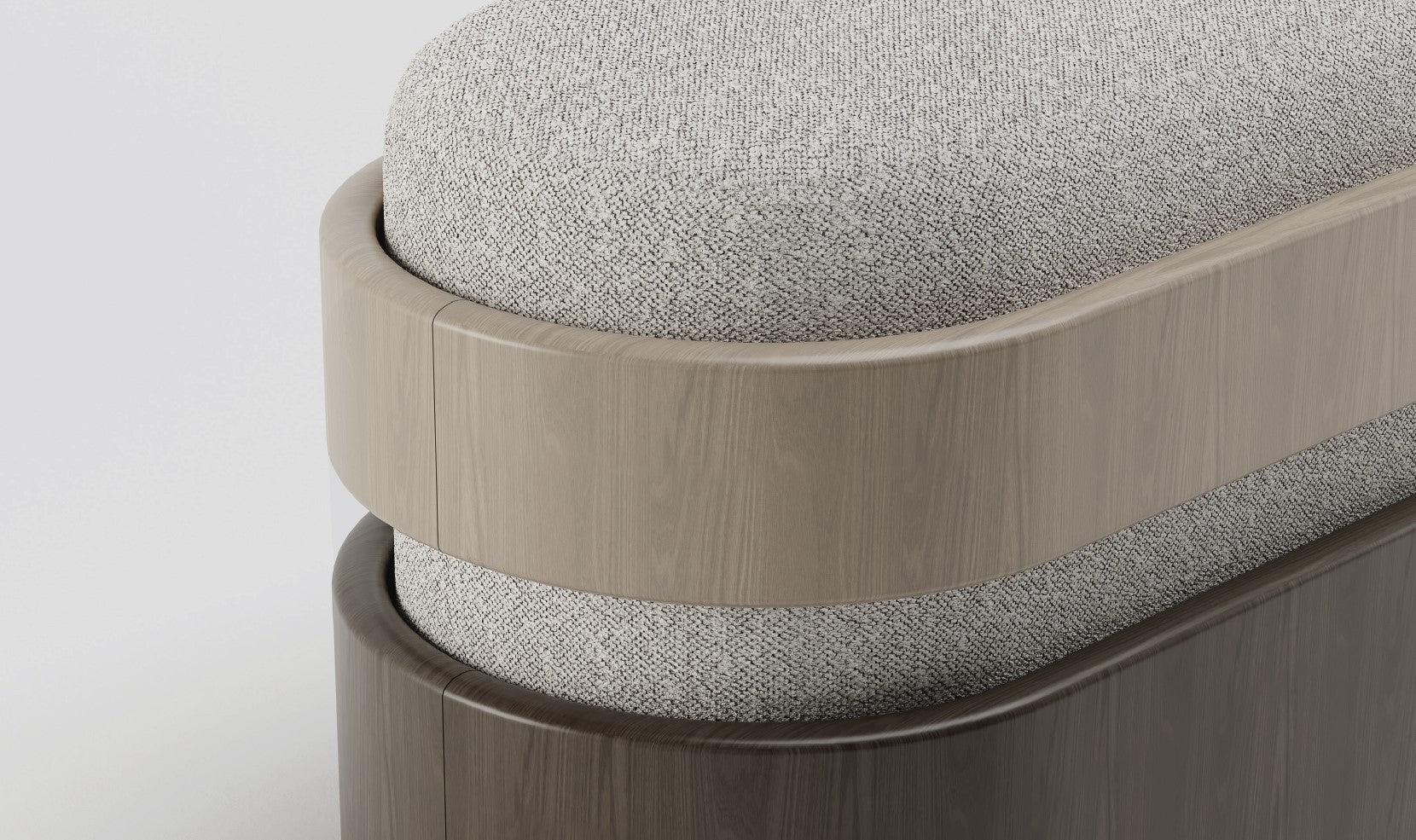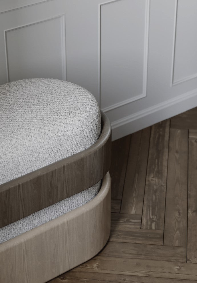 Era Bench by Emanuele Santalena. MATERIALS: Boucle fabric, Wood.