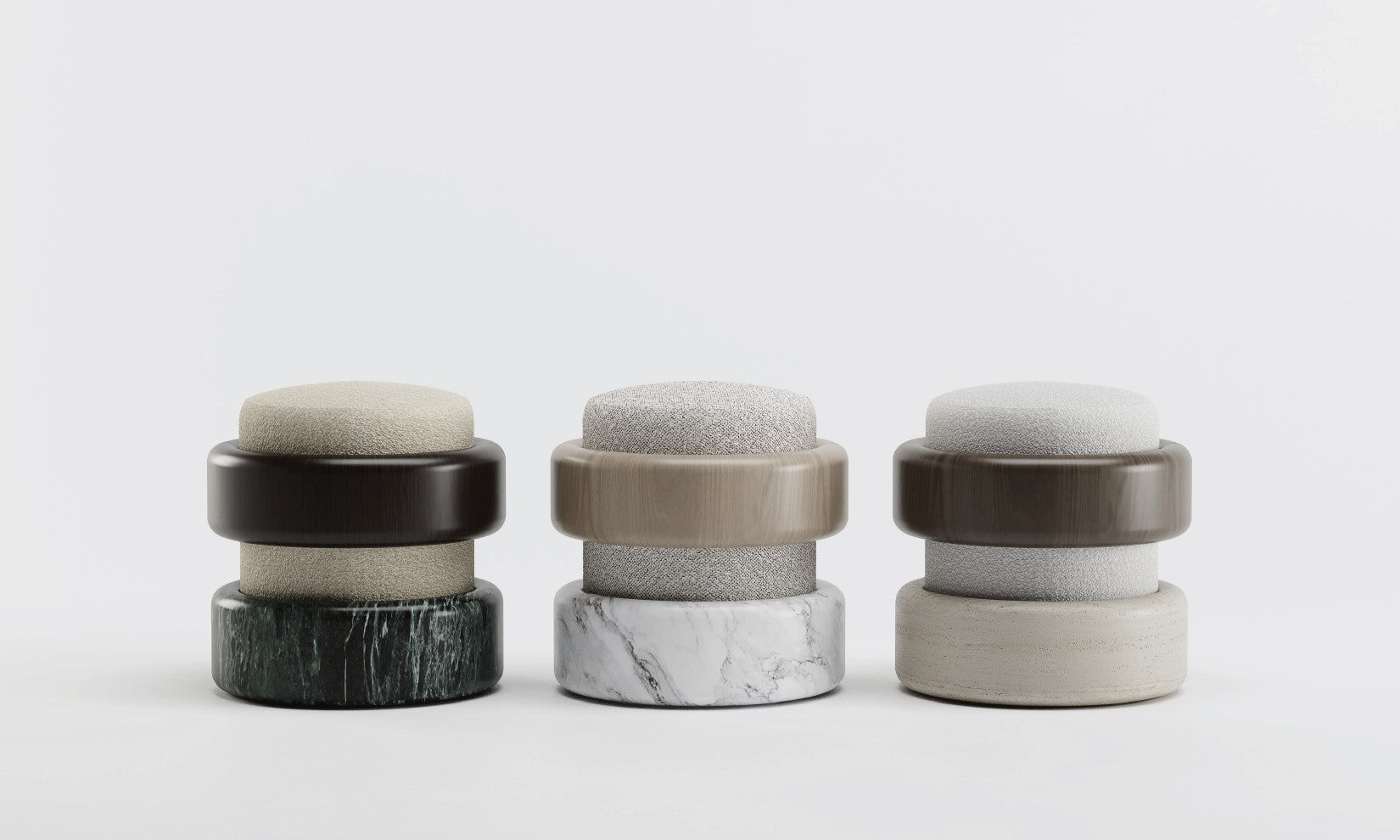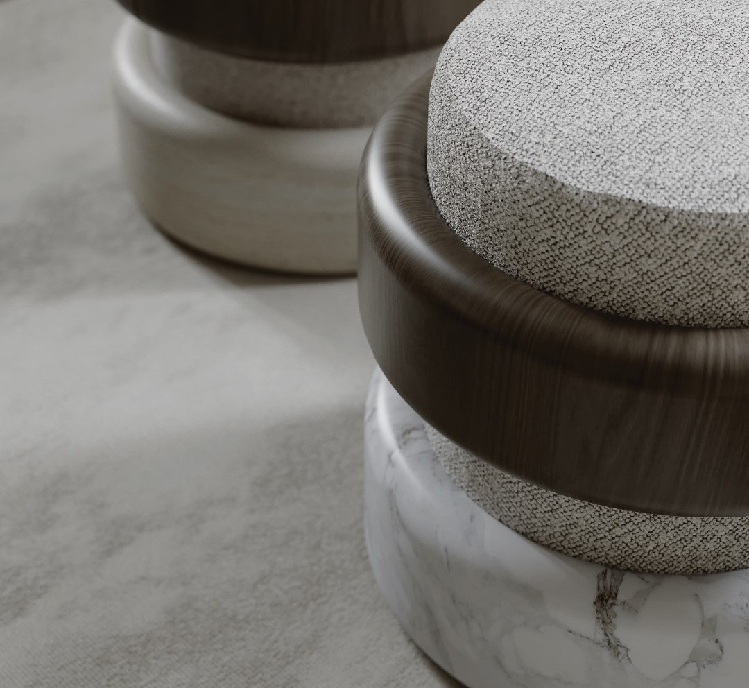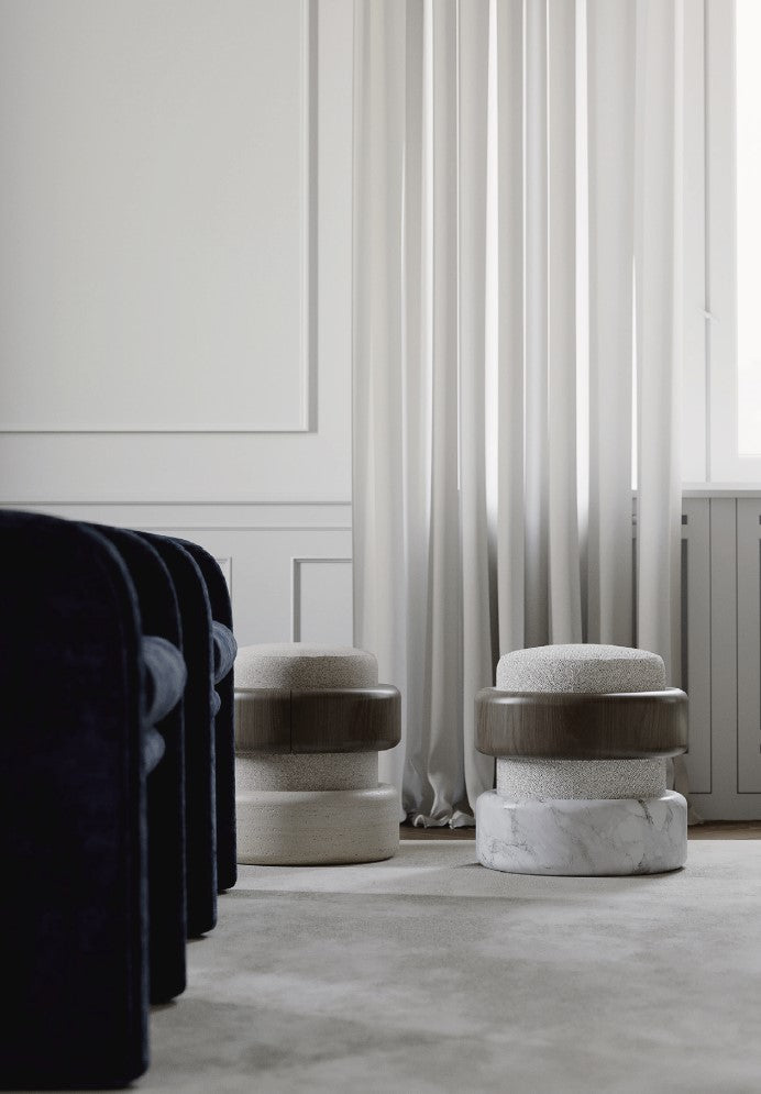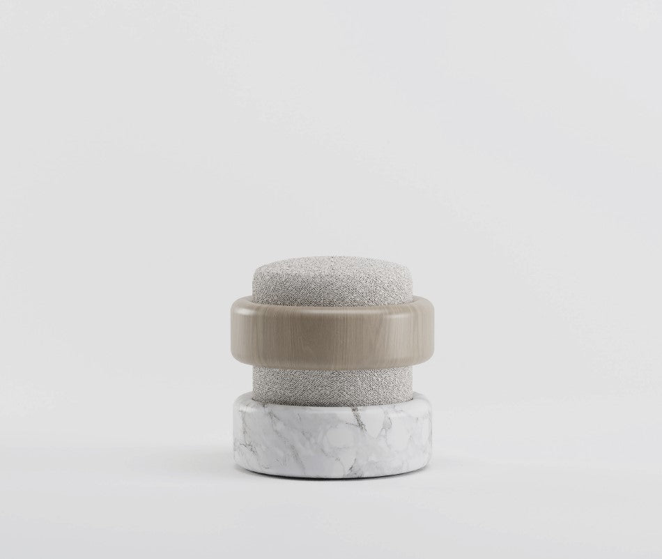 Era pouf by Emanuele Santalena . MATERIALS: Calacatta marble, Bouclè fabric, Wood