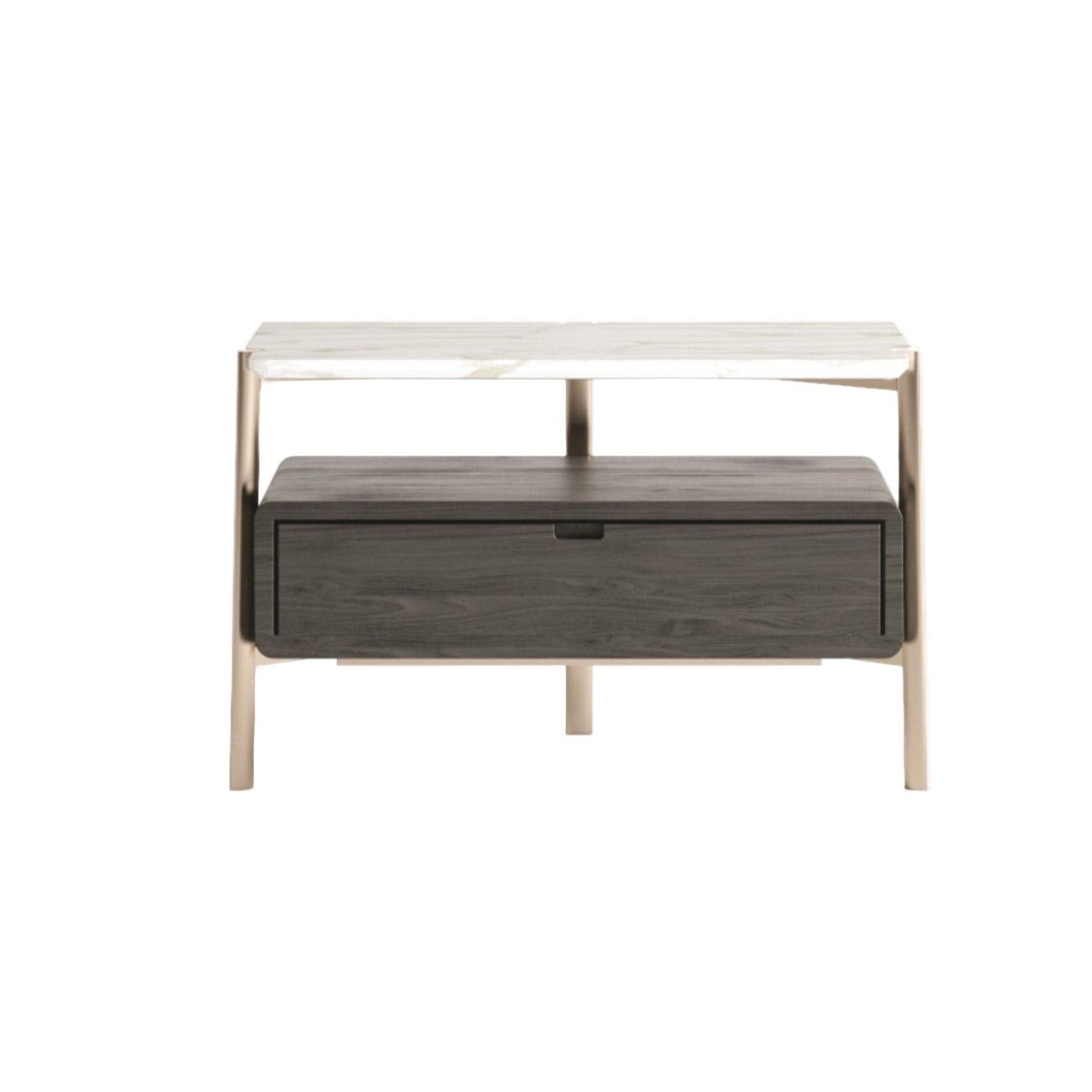 The Eros night group, consisting of a chest of drawers and bedside table, is characterized by the sophisticated dialogue between the different materials that compose it: metal, marble, wood. The bronze painted metal oval diameter structure supports a precious marble support surface through a sophisticated recess inside which it is inserted. The container in black-stained oak is suspended between the top and the floor, making it light and ethereal.
