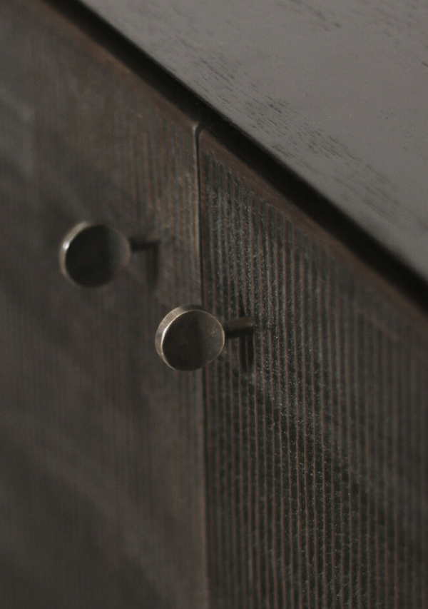 The Grooves cupboard is soulful to say the least. Every single line you see is hand carved, making each piece truly unique. Small imperfections are part of the story, even more so: they enhance Grooves' character. The result is a slightly different surface every time, each with its own rhythm and dynamics. The beautiful dark tinted teak continues on the inside, where shelves and drawers will hold your most cherished objects.