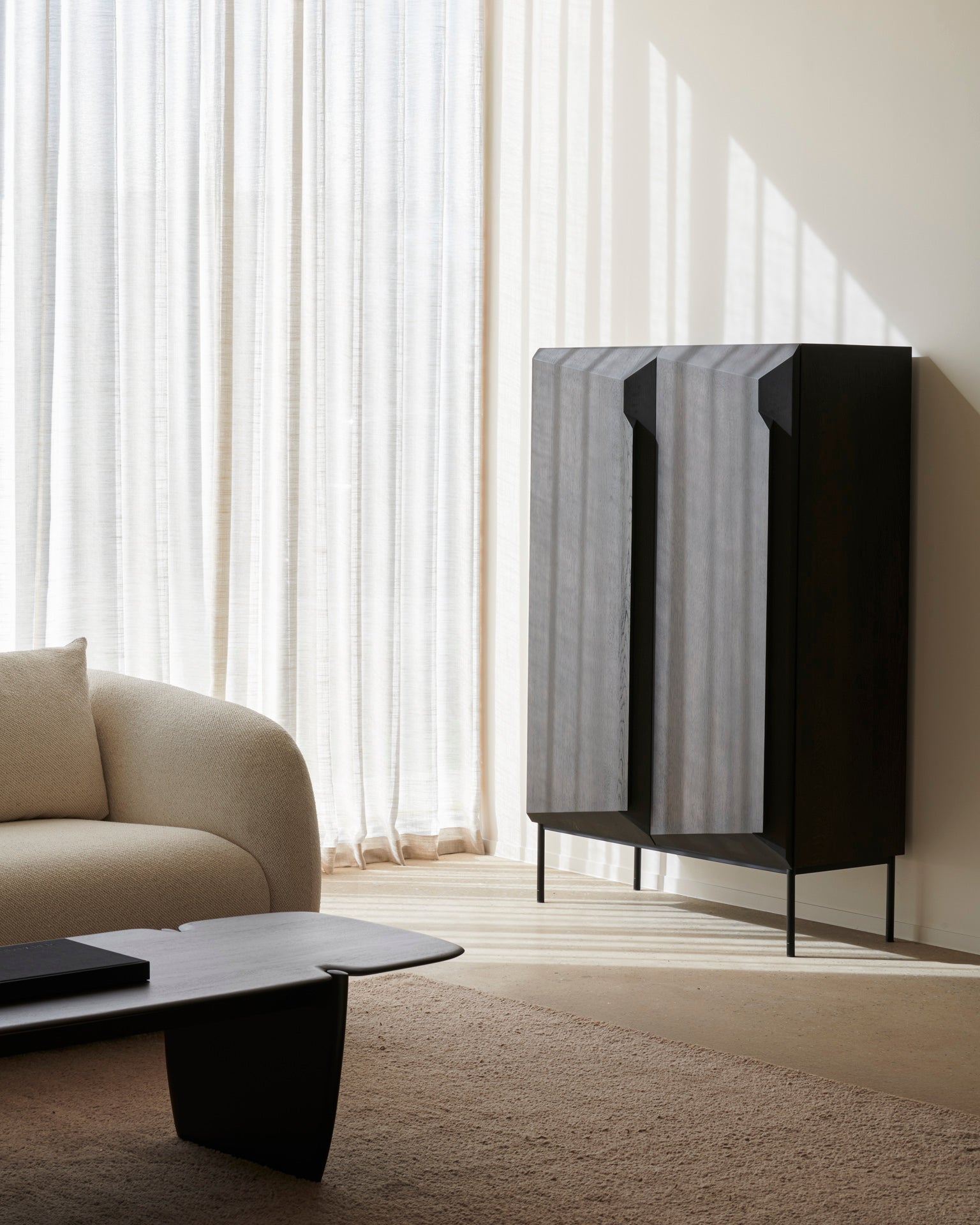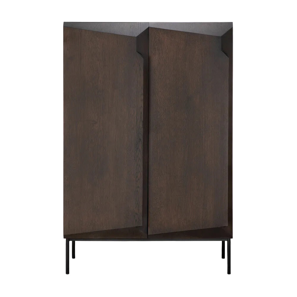 An angular composition, designed by Alain van Havre, forms the heart of a design that aims to distance itself from traditional static and immobile surfaces. A unique sense of volume is created which alters your perception of the cupboard as you walk by.