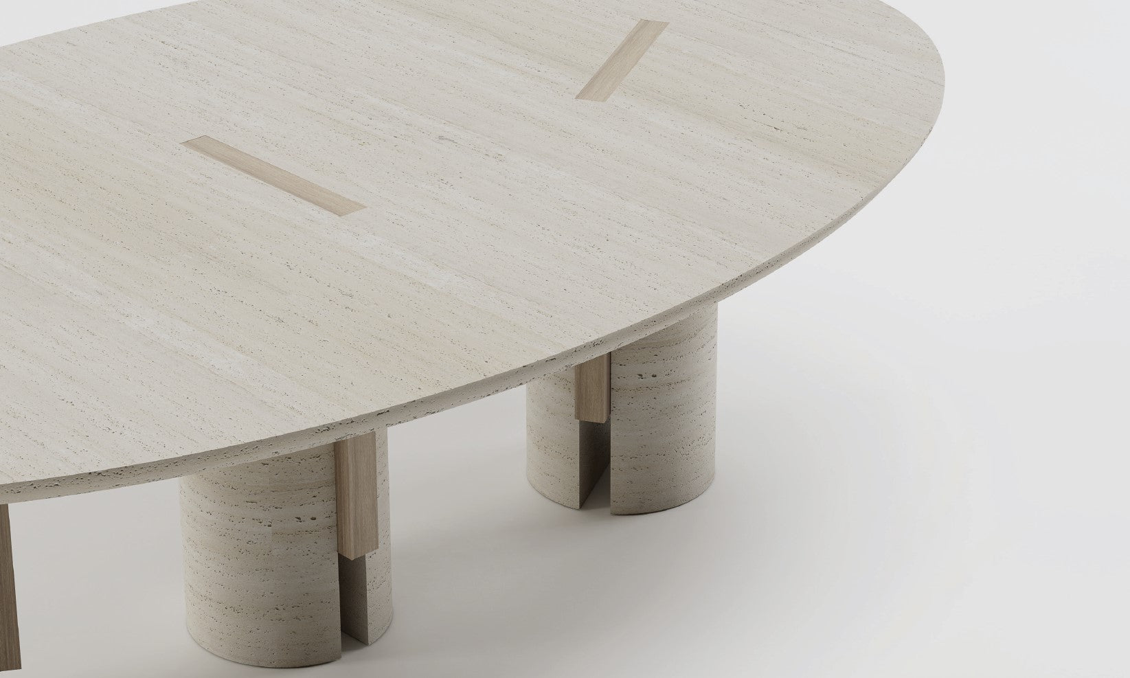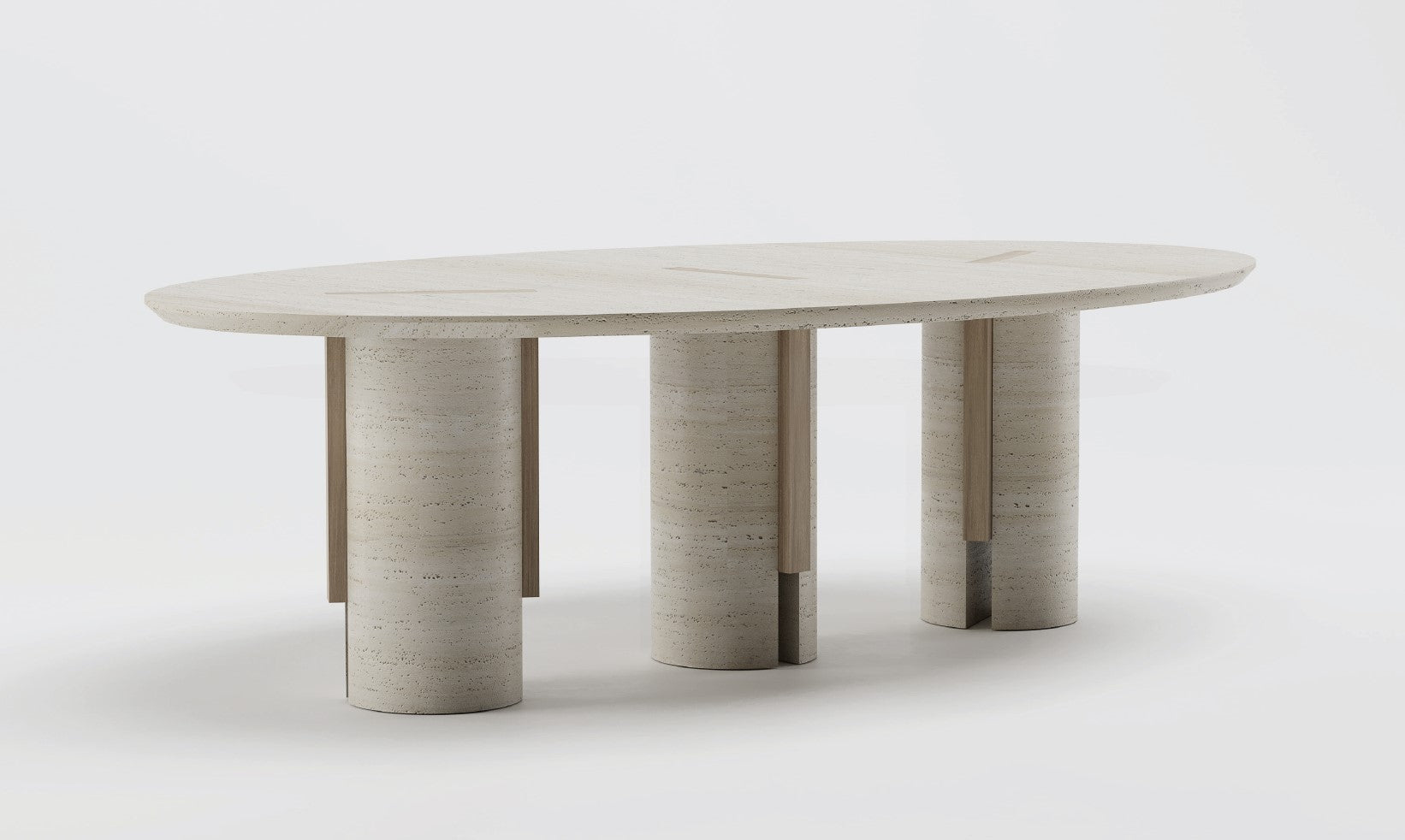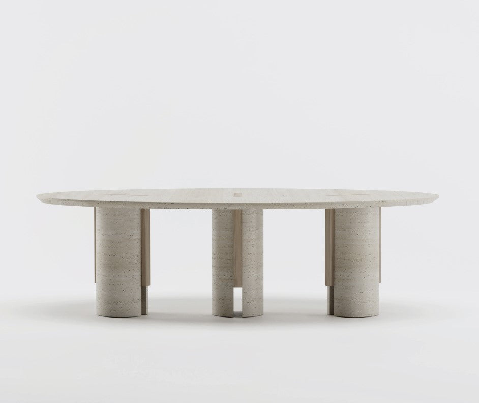 Coffee Table by Emanuele Santalena. MATERIALS: Travertine, Boucle fabric.