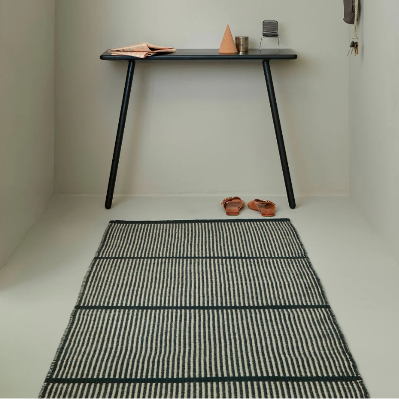 Hand-woven rug. Stripes on stripes – this hand-woven kilim in New Zealand wool has an interesting and simple spin on the classic striped rug. The long lines have been broken by thicker crossing stripes creating a very calm and defined look.