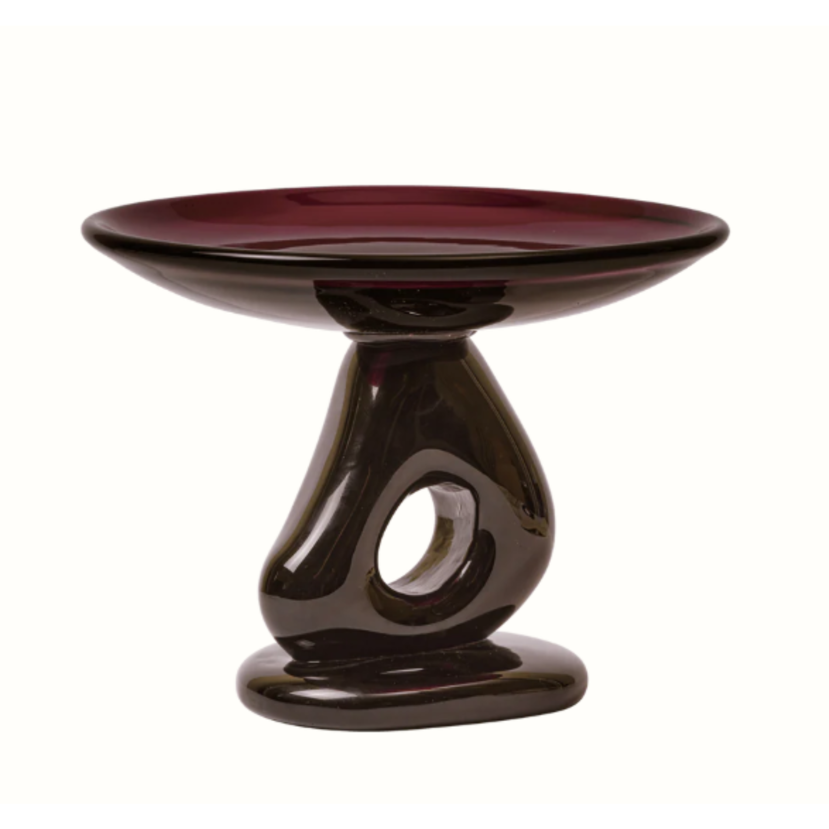 The Damo Glass Centrepiece embodies fluid elegance in a compact form. As the smaller counterpart to the larger Damo Centrepiece, it offers the same sculptural presence in a more refined scale. Crafted entirely from glass, its sculptural base and gently curved top create a light, floating presence, like water captured in motion. Named after Damona, the Celtic goddess of sacred waters, each handmade piece is uniquely shaped. Ideal for serving small treats or displaying objects, it adds a refined, sculptural touch to any setting.