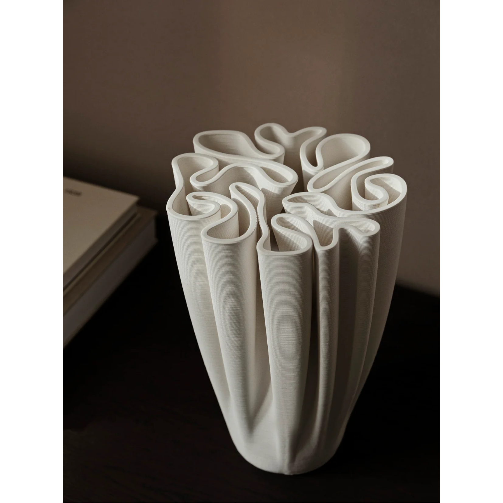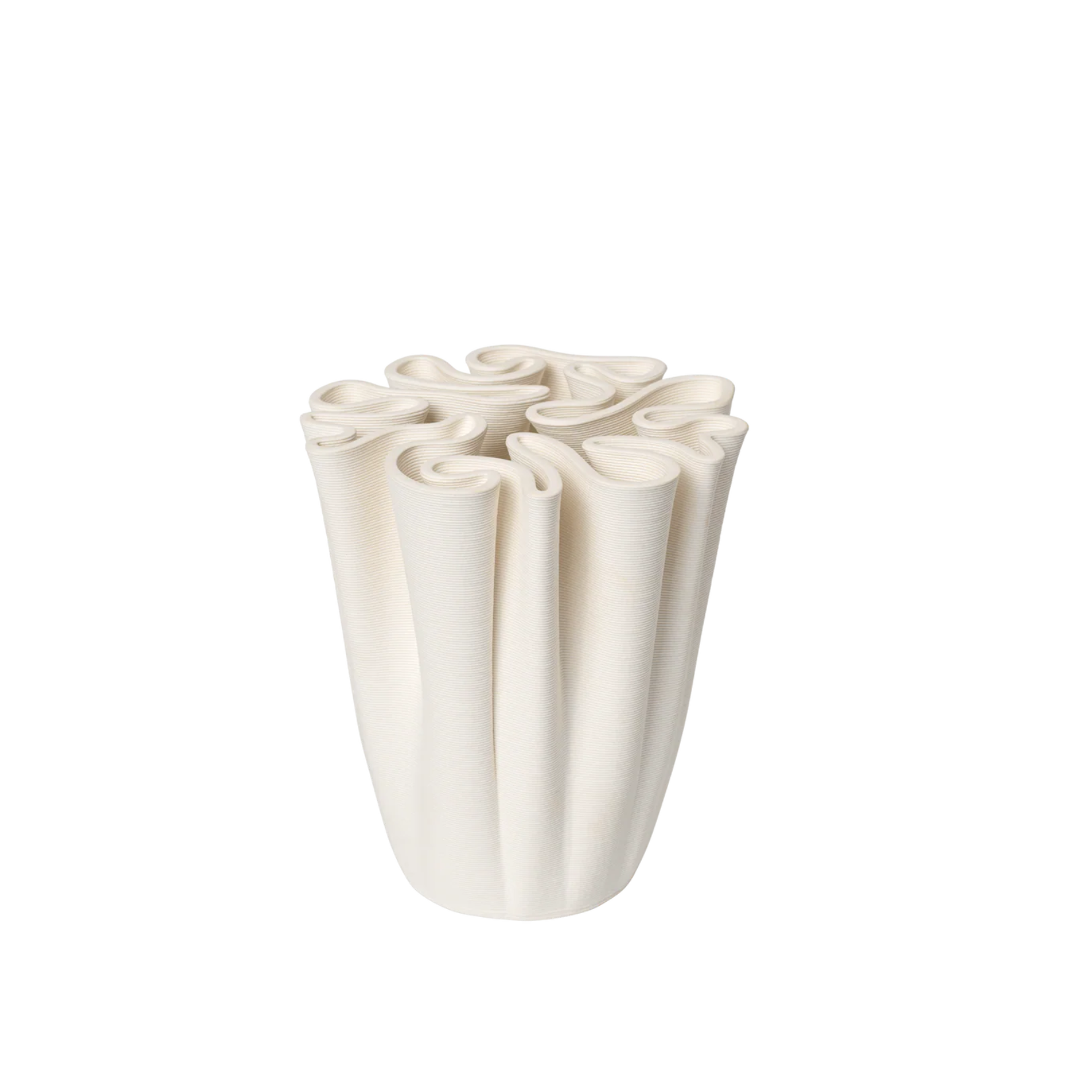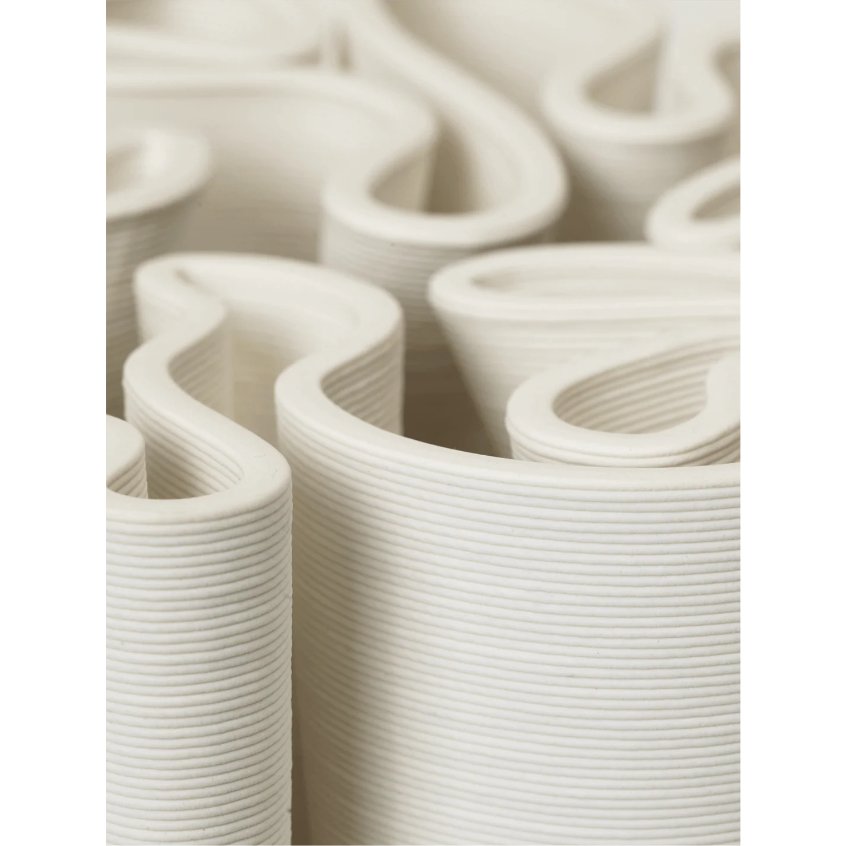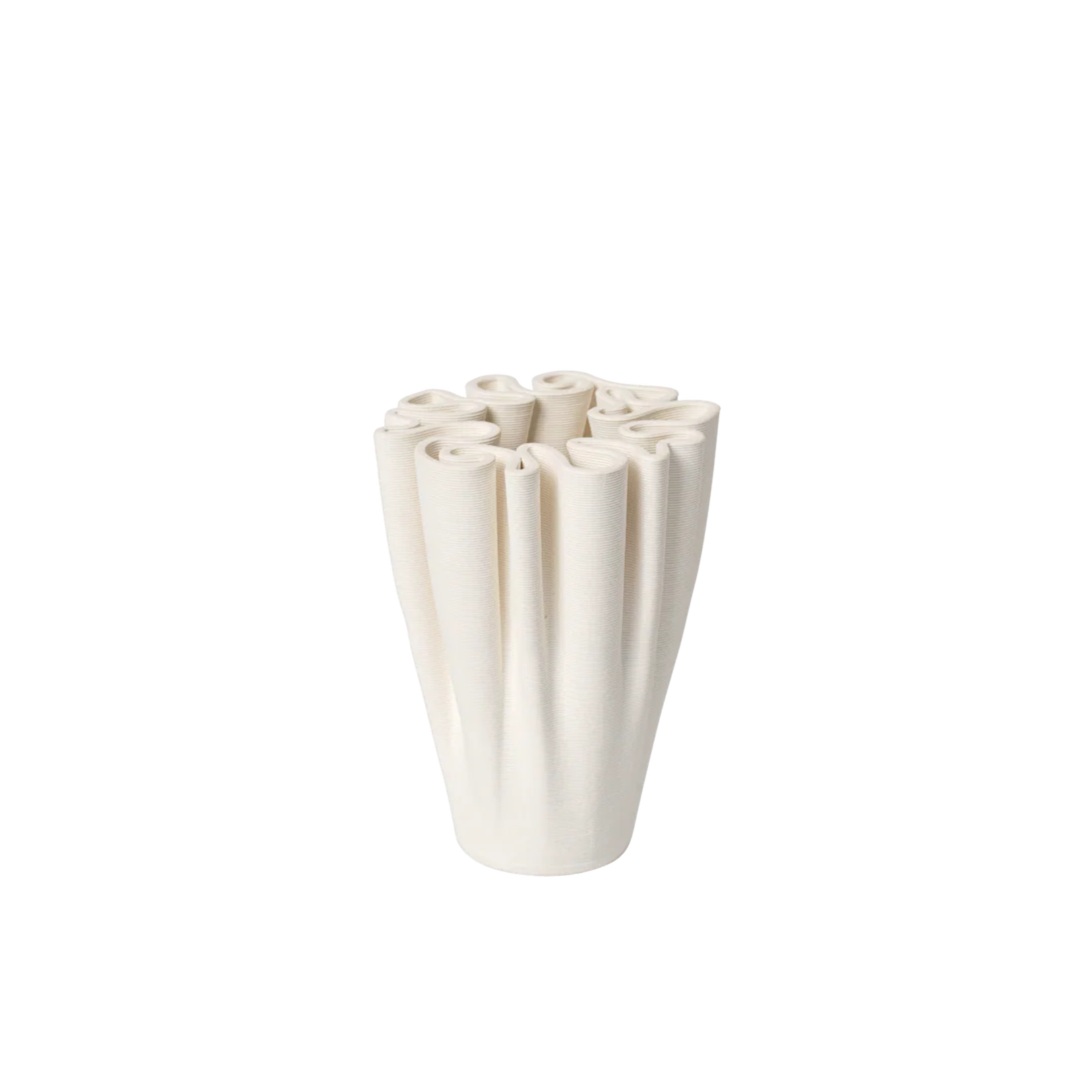 This compact variation of the Dedali Vase echoes the elaborate patterns of a 'Dédales' or labyrinth, offering the same fusion of art and utility in an updated form. Crafted from 3D-printed ceramic, its intricate labyrinth-like top is both visually striking and functional, perfect for arranging small floral displays in a voluminous, Ikebana-inspired style.