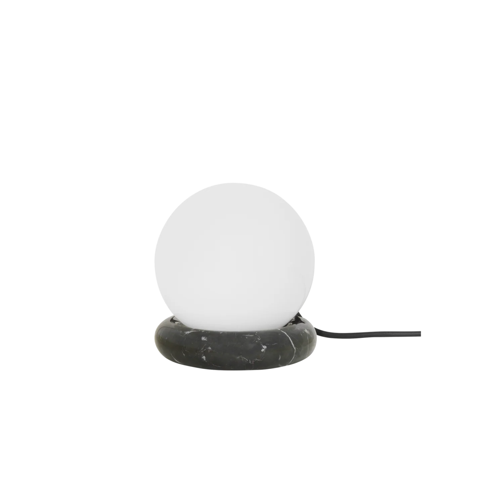 Resting on a ring of natural, solid black marble, the matte opal glass sphere makes a focal point in a room while brightening the space with its soft light. The socket is made of black powder coated metal, adding a raw finishing touch to the elegant lamp.