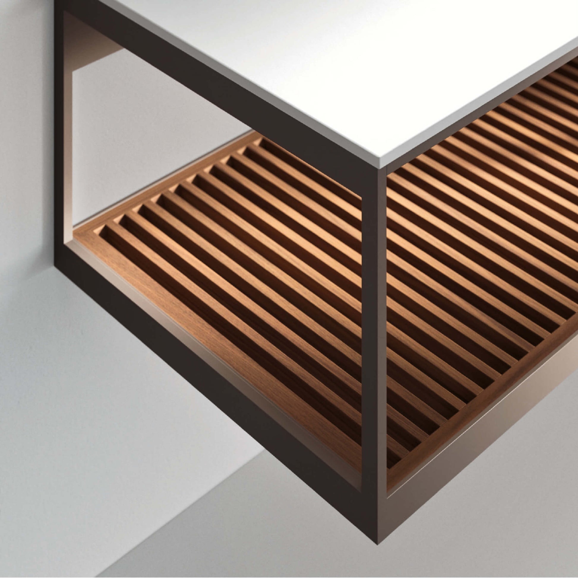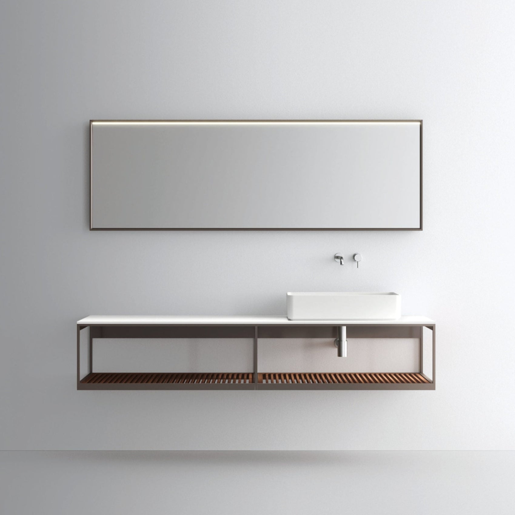 Basic R58 matt Ceramilux sit-on washbasin, Cristalplant Top. Open units with Titanio finish lacquered aluminium frame and Canaletto Noce strips. Ekos H mirror, single-sided interior horizontal LED lighting and Titanio finish lacquered aluminium profile. Flow taps in brushed stainless steel, with traditional cartridge.