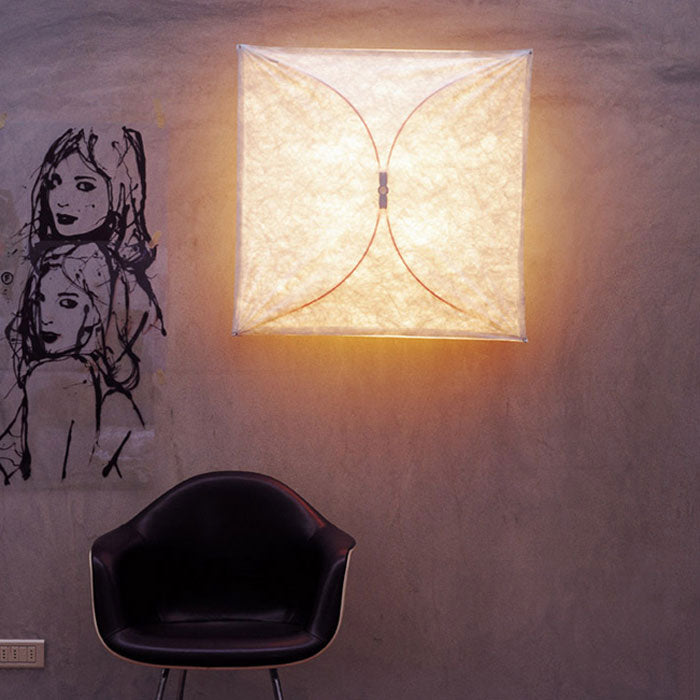 The Ariette Wall / Ceiling Light by FLOS provides texture and a soft ambient glow to a variety of interior settings. Its square silhouette consists of two synthetic fabric squares stretched over injection-molded fiberglass rods that diffuse light from a hidden light source. Diffusers rotate on a central mounting assembly.