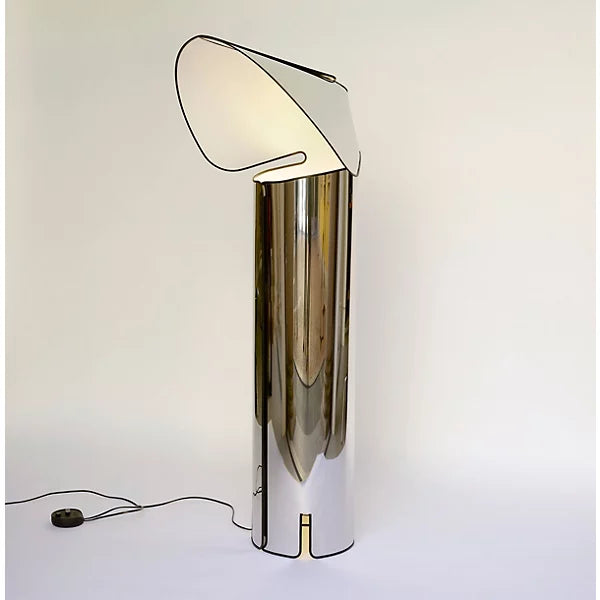 Crafted, seductive, emotional. Introduced in 1969, the iconic Chiara Floor Lamp from Flos is a piece named after designer Mario Bellini’s daughter and the Italian expression meaning ‘to shed light.’ It’s an attractive modern design, blurring the lines between art and lighting. Bellini originally crafted the piece with a form follows function approach. He wanted to create a luminaire that sent backlight into its environment with grace and intelligence. The floor lamp’s curve-wrapped top hat greets you with a warm light that sweeps across its surface. The light radiates through your rooms for an inviting ambiance. Made from folding laser-cut stainless steel and plastic film, the floor lamp stands with a cylindrical form concealing its light source. The sculptural reflective form brings rooms a high style and charming touch. Specifications- Designed by Mario Bellini in 1969