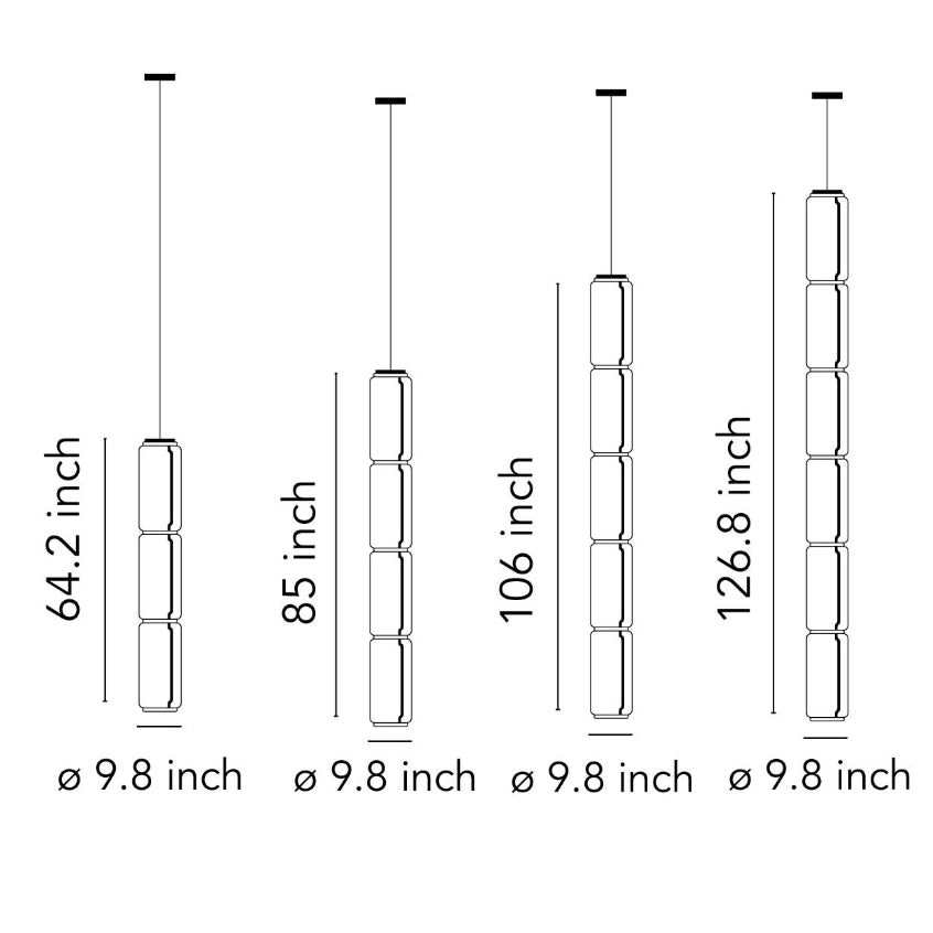 Dimensions3 Cylinder Option Canopy: Diameter 7.28"3 Cylinder Option Fixture: Height 54.72", Diameter 9.84", Weight 32.4Lbs3 Cylinder Option Maximum Hanging: Length Adjustable From 60.72", Adjustable To 212.12"4 Cylinder Option Canopy: Diameter 7.28"4 Cylinder Option Fixture: Height 72.44", Diameter 9.84", Weight 41.22Lbs4 Cylinder Option Maximum Hanging: Length Adjustable From 78.44", Adjustable To 229.84"5 Cylinder Option Canopy: Diameter 7.28"5 Cylinder Option Fixture: Height 90.16", Diameter 9.84", Weight 50.04Lbs5 Cylinder Option Maximum Hanging: Length Adjustable From 96.16", Adjustable To 247.56"
