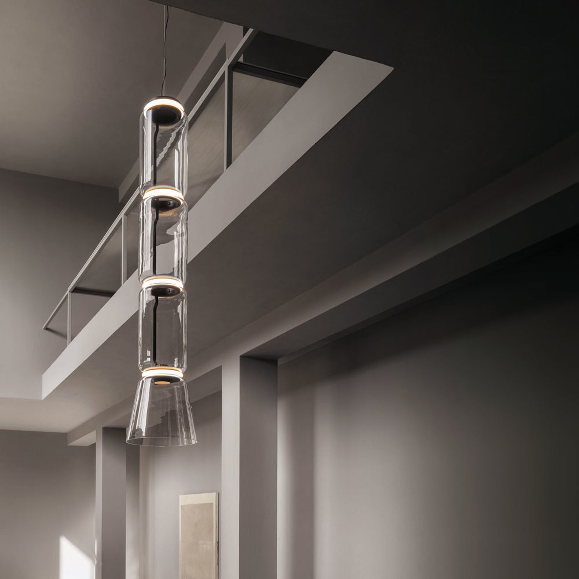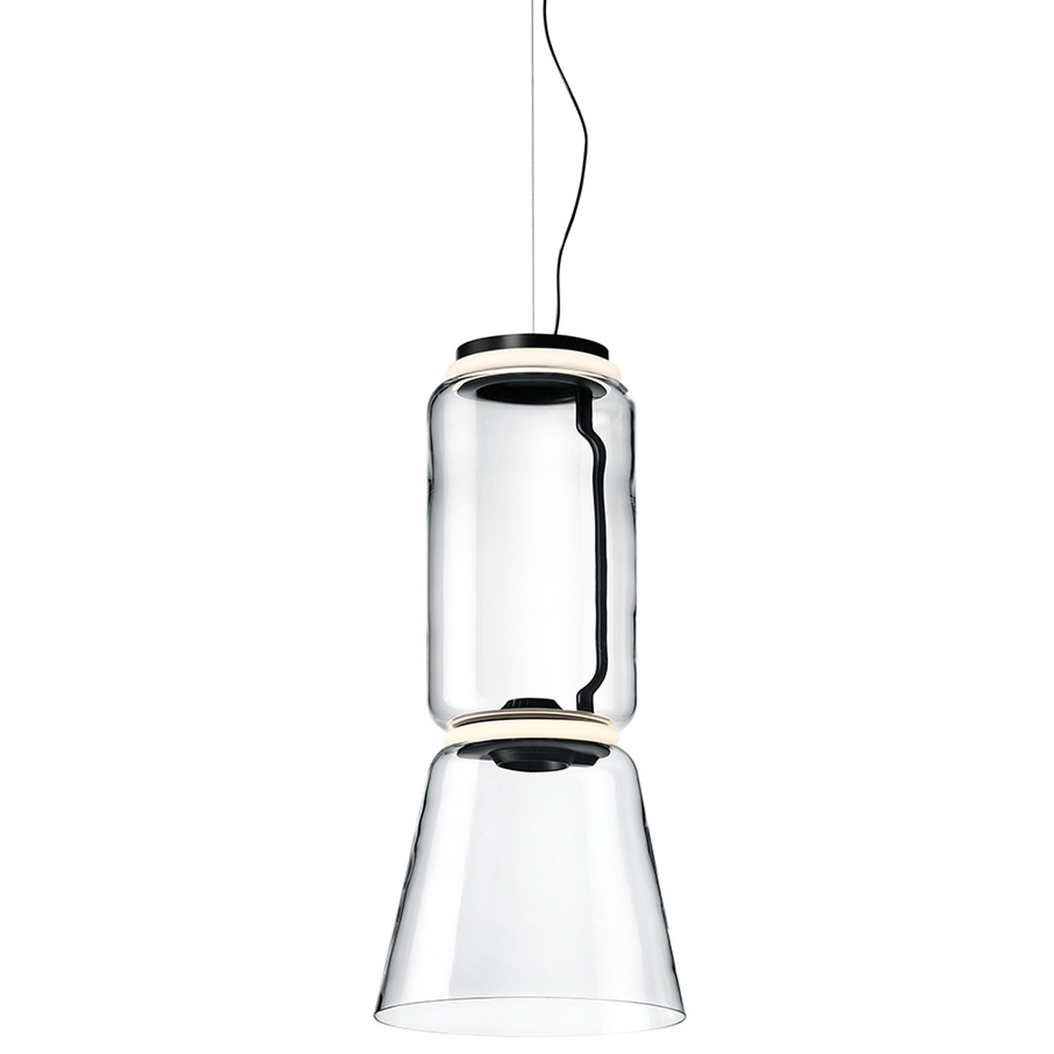 It’s easy to forget about a lighting fixture until the next night when you require its light. With the Noctambule Low Cylinder and Cone LED Pendant from FLOS, you’ll not only be admiring its pleasant glow at night, but also its sophisticated large-scaled glass construction during the brightness of the day. Made by multi-award-winning designer Konstantin Grcic, the word, “noctambule”, meaning night owl, informs the transformative nature of the piece. Ringed LEDs and silicon diffusers separate the blown glass cylindrical and coned shaped forms, generating a neat ambient glow. Its reflective quality captures its environment with an elegant and commanding presence. Specifications- Designed by Konstantin Grcic in 2019