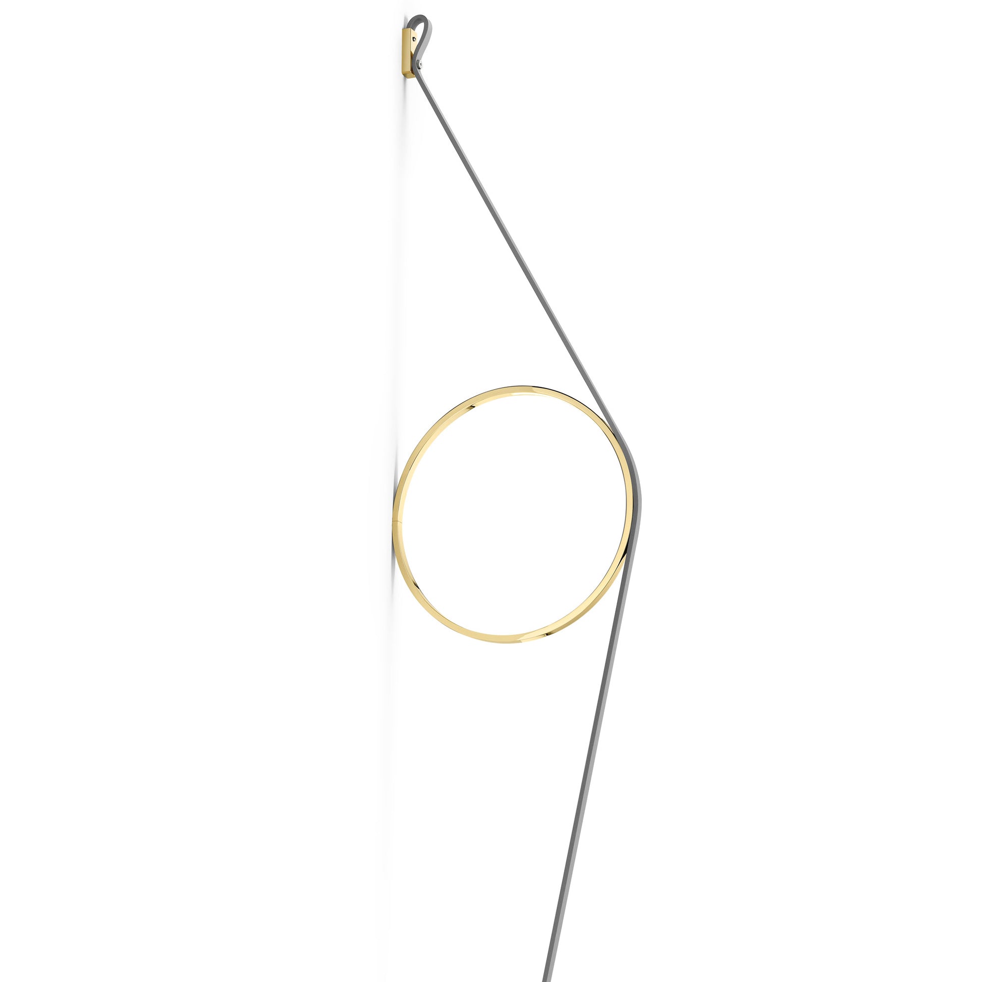 The Wirering Wall Light is an exercise in reduction, stripped back to its most essential elements, offering beautifully rendered light. The wire holds a simple ring fitted with an LED strip. Provides indirect light and is composed of extruded aluminum with a fine plated or painted finish. The special customized tangent cable, made of colored rubber, is fixed to the wall with ABS joints in the same finish as the ring. Includes foot On/Off/Dimmer switch on cord. Wirering uses a plug-in power supply with interchangeable plugs. Available with a Grey, Pink, or White cable and a Gold, Polished Black, White, Pink, or Grey ring.