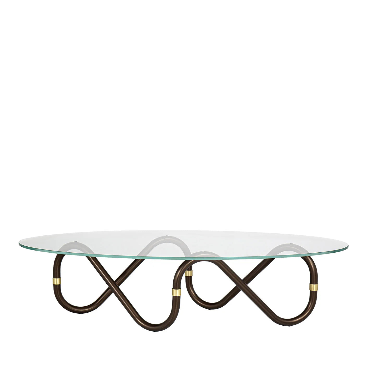 The Flow coffee table features a unique and fluid base made of Ø30 mm tubular metal shaped into irregular, modular sinusoidal waves. The design allows for customization with variations in the base shape—triangular, circular, or elongated—and a 10 mm thick glass top tailored to the selected form and space. Brass connection rings, available in various finishes, accent the composition and enhance its dynamic character. This table balances clean lines with a playful and unconventional attitude, offering a sculptural and versatile presence in contemporary interiors. For alternative finishes and customization options, please contact the Concierge.