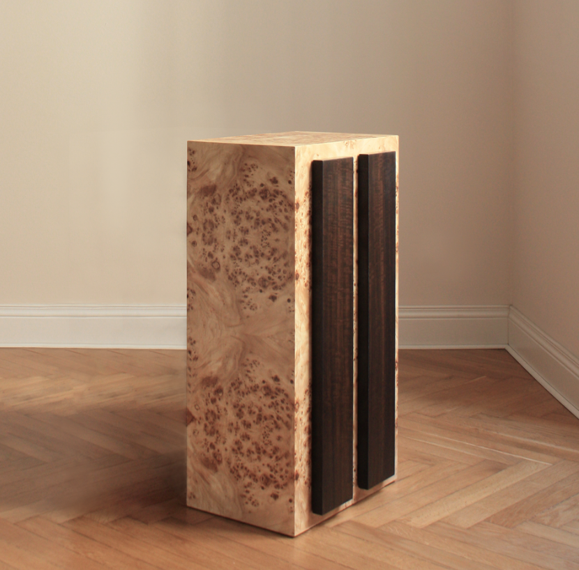 This side table, part of the Limited Edition of 50 pieces, restates the same bold proportions and purity of lines of Double 02 model, here again counterbalanced by the texture richness of Tamo Ash burl wood and Ebony Makassar, as a further subtle reframing of the Art Déco aesthetic.